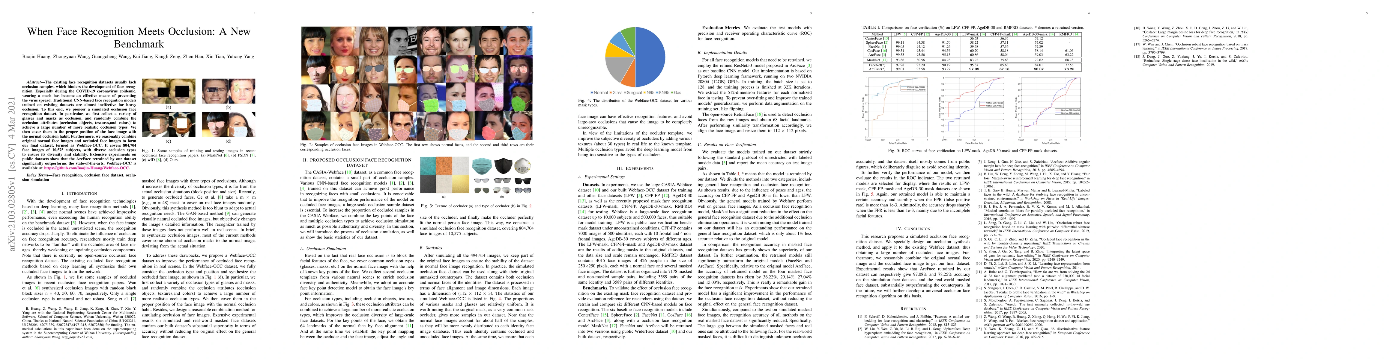 This paper introduces Webface-OCC, a new benchmark dataset for occluded face recognition, addressing the lack of occlusion samples in existing datasets. The dataset includes 804,704 face images of 10,575 subjects with diverse occlusion types, significantly improving the performance of ArcFace models over state-of-the-art methods.