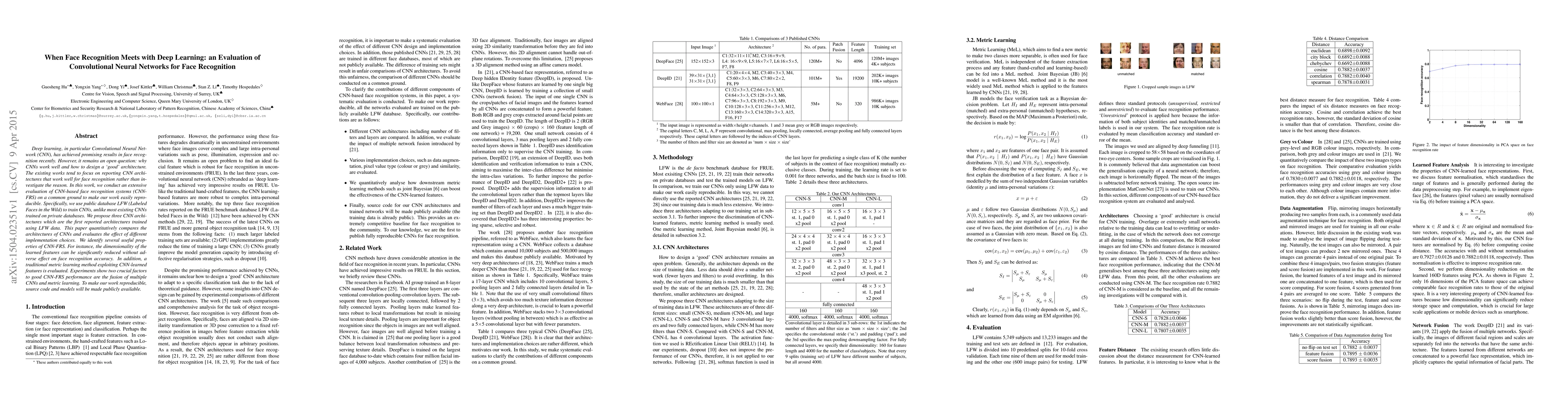This paper evaluates Convolutional Neural Networks (CNNs) for face recognition, proposing three new CNN architectures trained on the public LFW dataset. It identifies key factors like multi-CNN fusion and metric learning for optimal performance, and aims to enhance reproducibility by making source code and models publicly available.