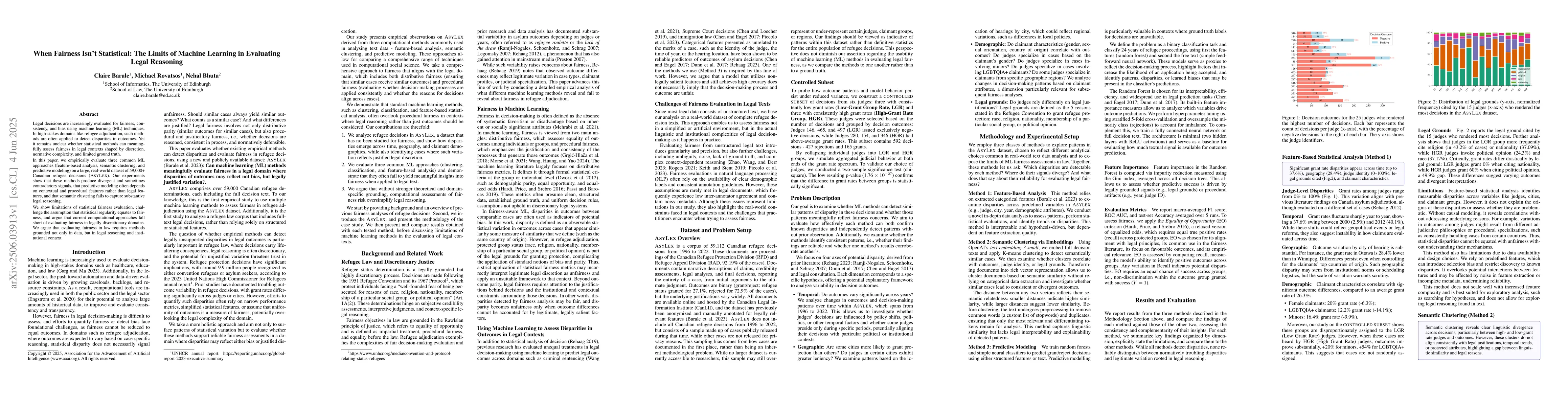 The paper demonstrates the limitations of statistical fairness evaluation methods in legal contexts, specifically in refugee adjudication decisions.
