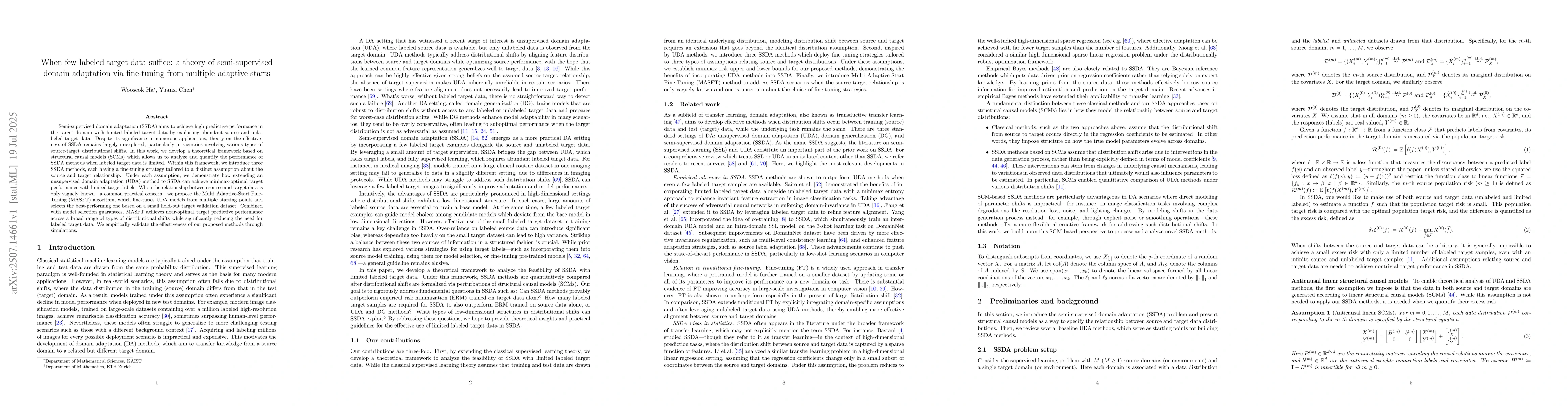 This research introduces a theoretical framework using structural causal models to analyze semi-supervised domain adaptation (SSDA) performance with limited labeled target data. It proposes three SSDA methods, each with a fine-tuning strategy for distinct source-target relationships, and introduces MASFT, an algorithm that adapts from multiple starting points to handle unknown relationships, significantly reducing the need for labeled target data.