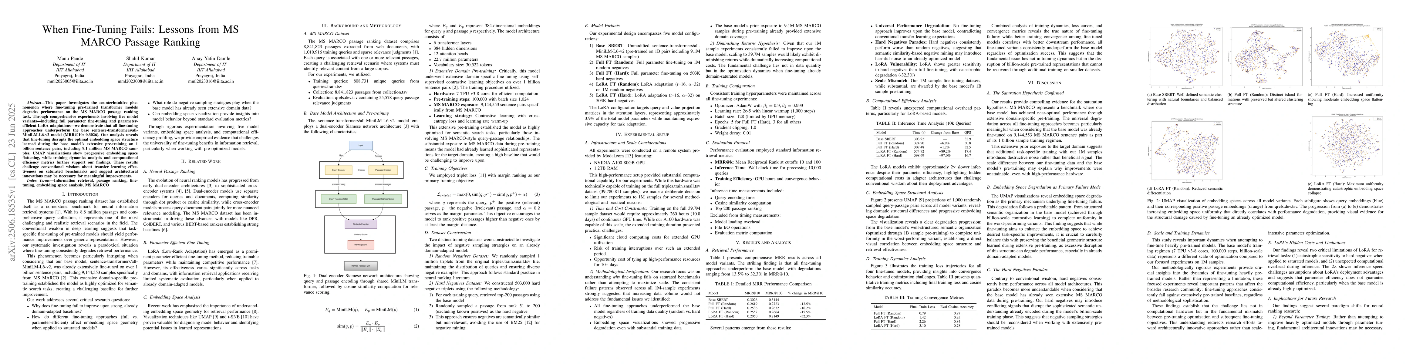 This paper investigates the counterintuitive phenomenon where fine-tuning pre-trained transformer models degrades performance on the MS MARCO passage ranking task. Through comprehensive experiments involving five model variants-including full parameter fine-tuning and parameter efficient LoRA adaptations-we demonstrate that all fine-tuning approaches underperform the base sentence-transformers/all- MiniLM-L6-v2 model (MRR@10: 0.3026). Our analysis reveals that fine-tuning disrupts the optimal embedding space structure learned during the base model's extensive pre-training on 1 billion sentence pairs, including 9.1 million MS MARCO samples. UMAP visualizations show progressive embedding space flattening, while training dynamics analysis and computational efficiency metrics further support our findings. These results challenge conventional wisdom about transfer learning effectiveness on saturated benchmarks and suggest architectural innovations may be necessary for meaningful improvements.