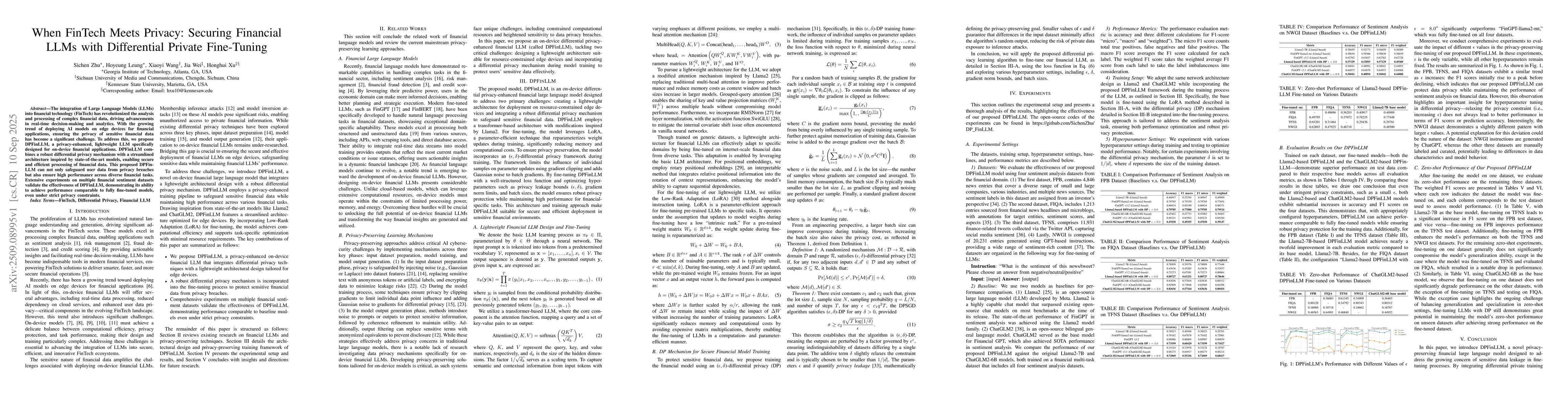 The integration of Large Language Models (LLMs) into financial technology (FinTech) has revolutionized the analysis and processing of complex financial data, driving advancements in real-time decision-making and analytics. With the growing trend of deploying AI models on edge devices for financial applications, ensuring the privacy of sensitive financial data has become a significant challenge. To address this, we propose DPFinLLM, a privacy-enhanced, lightweight LLM specifically designed for on-device financial applications. DPFinLLM combines a robust differential privacy mechanism with a streamlined architecture inspired by state-of-the-art models, enabling secure and efficient processing of financial data. This proposed DPFinLLM can not only safeguard user data from privacy breaches but also ensure high performance across diverse financial tasks. Extensive experiments on multiple financial sentiment datasets validate the effectiveness of DPFinLLM, demonstrating its ability to achieve performance comparable to fully fine-tuned models, even under strict privacy constraints.