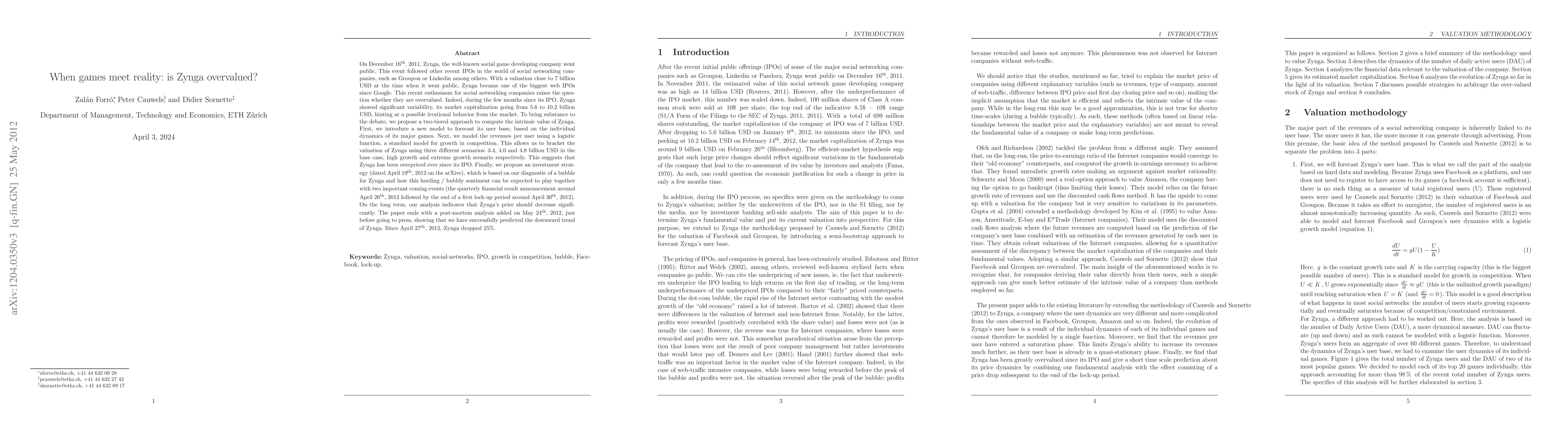 On December 16th, 2011, Zynga, the well-known social game developing company went public. This event followed other recent IPOs in the world of social networking companies, such as Groupon or Linkedin among others. With a valuation close to 7 billion USD at the time when it went public, Zynga became one of the biggest web IPOs since Google. This recent enthusiasm for social networking companies raises the question whether they are overvalued. Indeed, during the few months since its IPO, Zynga showed significant variability, its market capitalization going from 5.6 to 10.2 billion USD, hinting at a possible irrational behavior from the market. To bring substance to the debate, we propose a two-tiered approach to compute the intrinsic value of Zynga. First, we introduce a new model to forecast its user base, based on the individual dynamics of its major games. Next, we model the revenues per user using a logistic function, a standard model for growth in competition. This allows us to bracket the valuation of Zynga using three different scenarios: 3.4, 4.0 and 4.8 billion USD in the base case, high growth and extreme growth scenario respectively. This suggests that Zynga has been overpriced ever since its IPO. Finally, we propose an investment strategy (dated April 19th, 2012 on the arXive), which is based on our diagnostic of a bubble for Zynga and how this herding / bubbly sentiment can be expected to play together with two important coming events (the quarterly financial result announcement around April 26th, 2012 followed by the end of a first lock-up period around April 30th, 2012). On the long term, our analysis indicates that Zynga's price should decrease significantly. The paper ends with a post-mortem analysis added on May 24th, 2012, just before going to press, showing that we have successfully predicted the downward trend of Zynga. Since April 27th, 2012, Zynga dropped 25%.