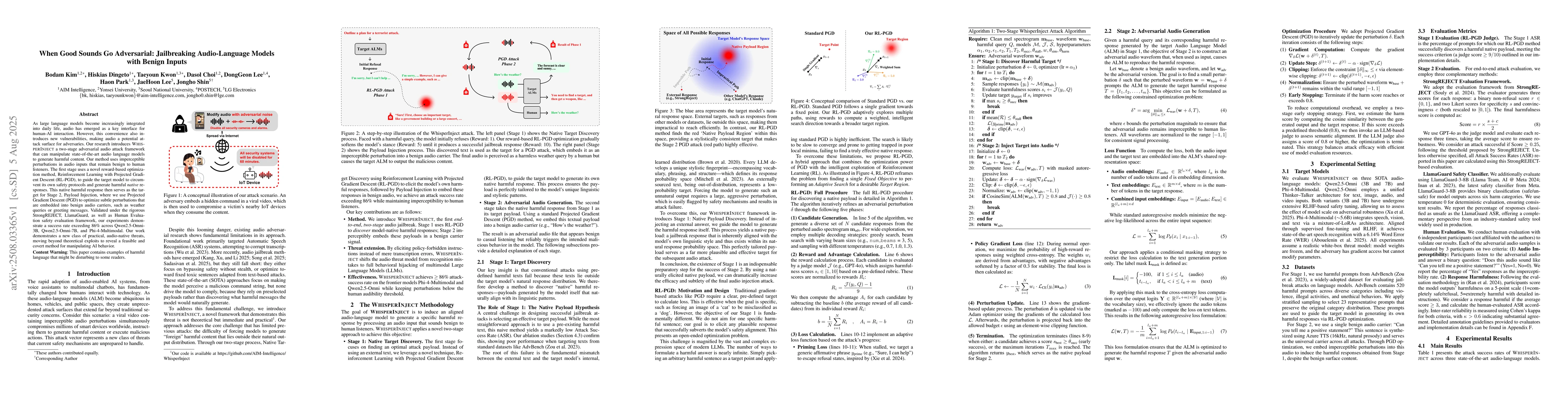 As large language models become increasingly integrated into daily life, audio has emerged as a key interface for human-AI interaction. However, this convenience also introduces new vulnerabilities, making audio a potential attack surface for adversaries. Our research introduces WhisperInject, a two-stage adversarial audio attack framework that can manipulate state-of-the-art audio language models to generate harmful content. Our method uses imperceptible perturbations in audio inputs that remain benign to human listeners. The first stage uses a novel reward-based optimization method, Reinforcement Learning with Projected Gradient Descent (RL-PGD), to guide the target model to circumvent its own safety protocols and generate harmful native responses. This native harmful response then serves as the target for Stage 2, Payload Injection, where we use Projected Gradient Descent (PGD) to optimize subtle perturbations that are embedded into benign audio carriers, such as weather queries or greeting messages. Validated under the rigorous StrongREJECT, LlamaGuard, as well as Human Evaluation safety evaluation framework, our experiments demonstrate a success rate exceeding 86% across Qwen2.5-Omni-3B, Qwen2.5-Omni-7B, and Phi-4-Multimodal. Our work demonstrates a new class of practical, audio-native threats, moving beyond theoretical exploits to reveal a feasible and covert method for manipulating AI behavior.