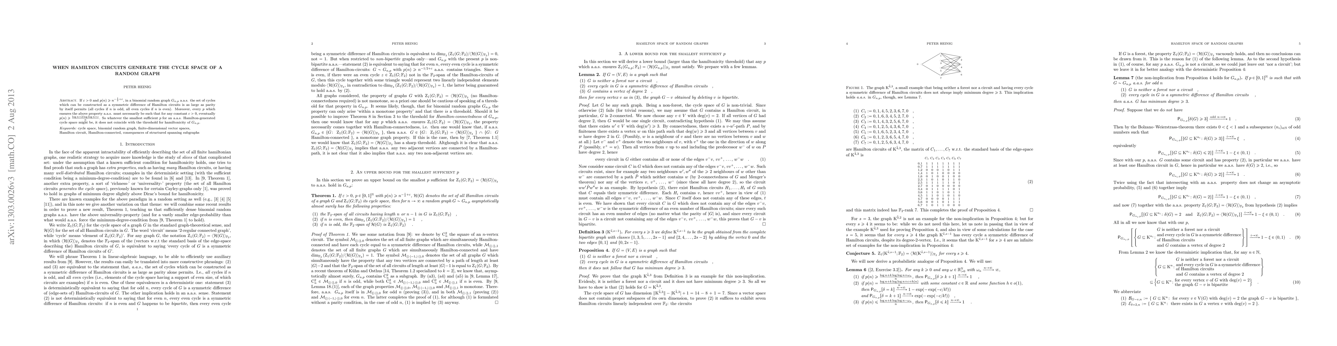 If eps > 0 and p >= n^{-1/2 + eps}, in a binomial random graph G(n,p) a.a.s. the set of cycles which can be constructed as a symmetric difference of Hamilton circuits is as large as parity by itself permits (all cycles if n is odd, all even cycles if n is even). Moreover, every p which ensures the above property a.a.s. must necessarily be such that for any constant c>0, eventually p >= (log n + 2 log log n + c)/n. So, whatever the smallest sufficient p for an a.a.s. Hamilton-generated cycle space might be, it does not coincide with the threshold for hamiltonicity of G(n,p).