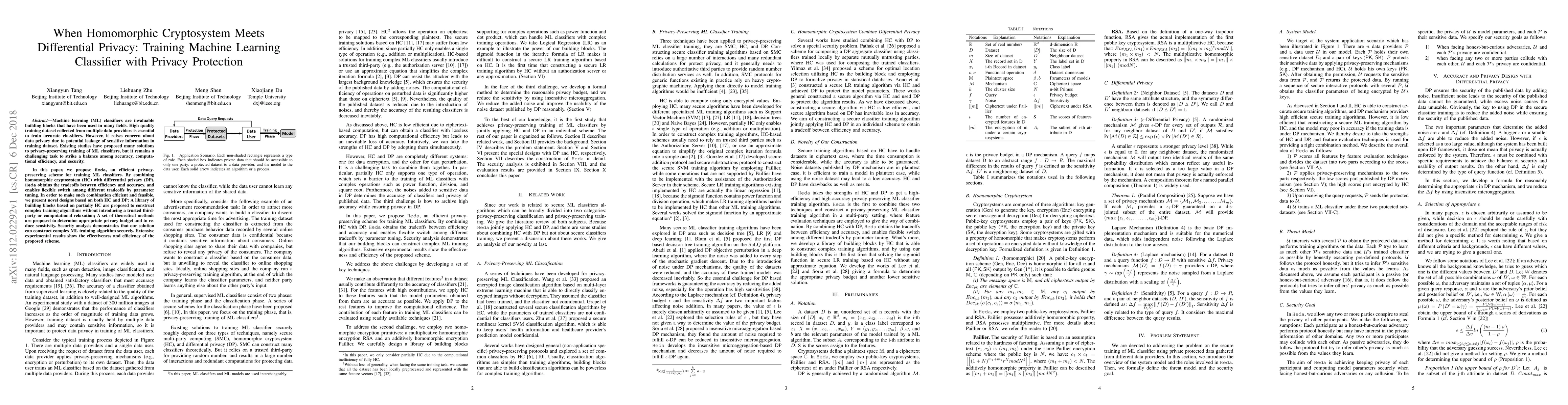 This paper proposes Heda, a privacy-preserving scheme for training machine learning classifiers by combining homomorphic cryptosystem with differential privacy, achieving a balance between accuracy, efficiency, and security through parameter tuning. The scheme includes novel designs and theoretical methods to ensure secure and efficient training without a trusted third party.
