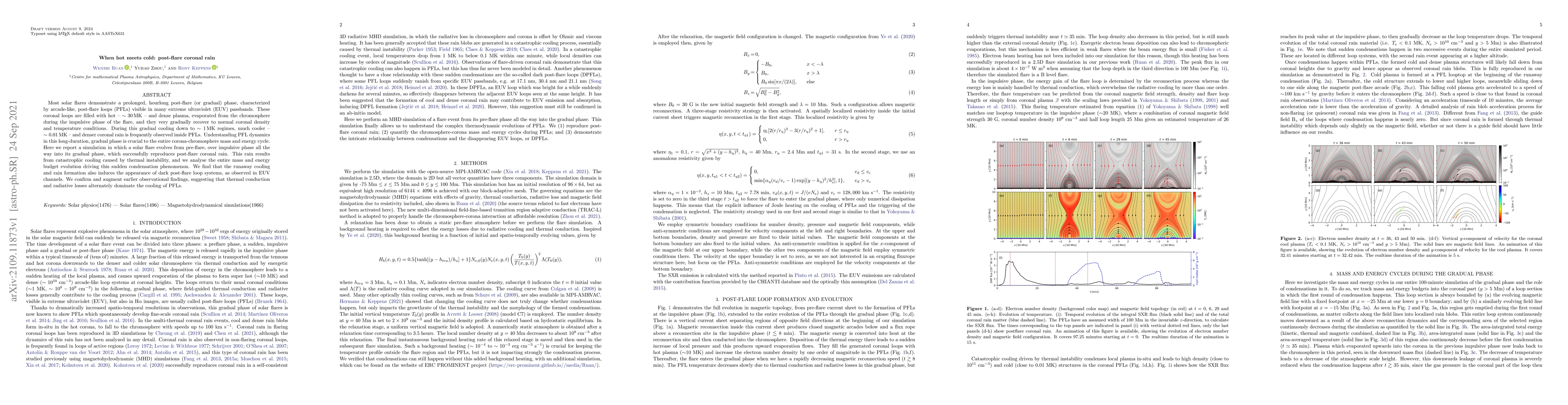 This paper investigates the dynamics of post-flare coronal rain in solar flares, focusing on the gradual cooling phase where hot plasma condenses into much cooler, dense coronal rain. The study uses simulations to reproduce this phenomenon, attributing it to thermal instability, and analyzes the mass and energy budget changes driving this sudden condensation.