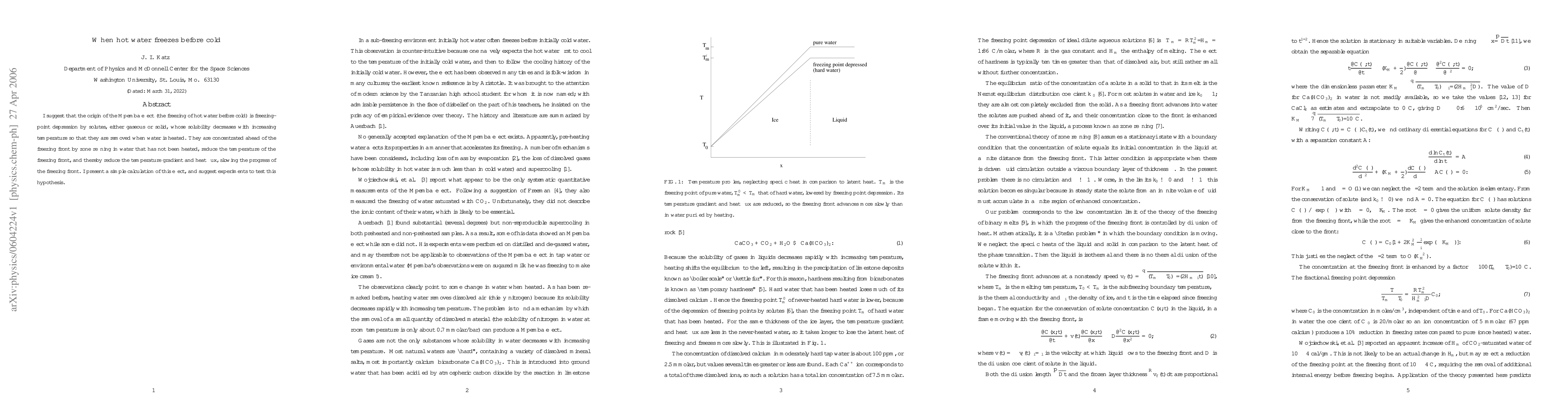 The Mpemba effect, where hot water freezes before cold, may be due to solutes whose solubility decreases with temperature, leading to their removal when water is heated. These solutes concentrate ahead of the freezing front, reducing the freezing point and slowing the freezing process.