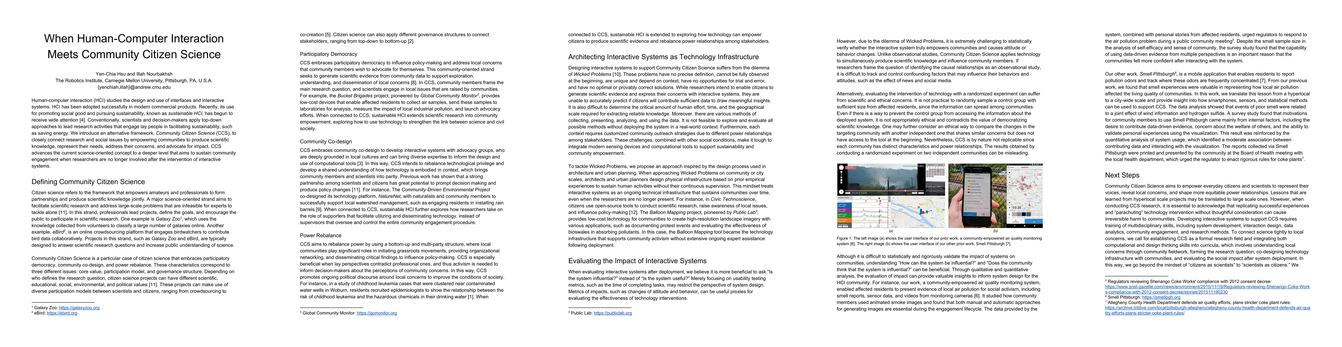 Human-computer interaction (HCI) studies the design and use of interfaces and interactive systems. HCI has been adopted successfully in modern commercial products. Recently, its use for promoting social good and pursuing sustainability, known as sustainable HCI, has begun to receive wide attention. Conventionally, scientists and decision-makers apply top-down approaches to lead research activities that engage lay people in facilitating sustainability, such as saving energy. We introduce an alternative framework, Community Citizen Science (CCS), to closely connect research and social issues by empowering communities to produce scientific knowledge, represent their needs, address their concerns, and advocate for impact. CCS advances the current science-oriented concept to a deeper level that aims to sustain community engagement when researchers are no longer involved after the intervention of interactive systems.