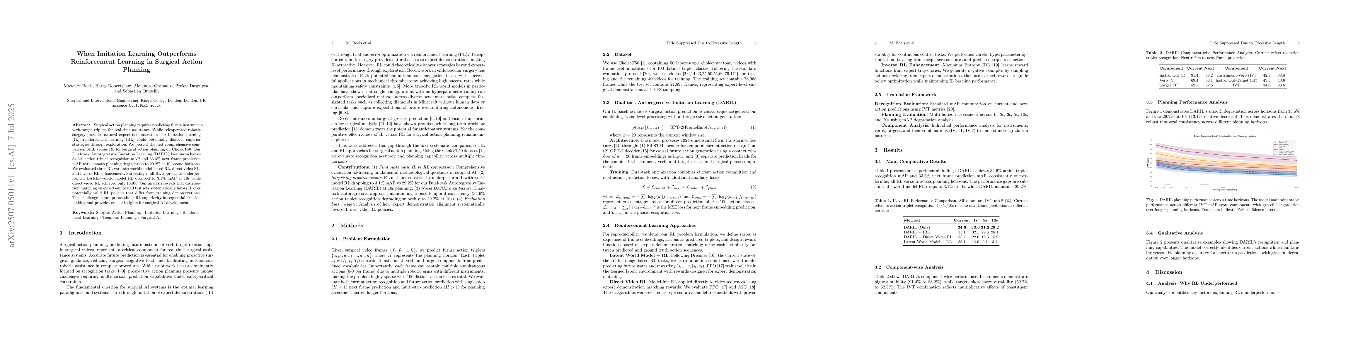Surgical action planning requires predicting future instrument-verb-target triplets for real-time assistance. While teleoperated robotic surgery provides natural expert demonstrations for imitation learning (IL), reinforcement learning (RL) could potentially discover superior strategies through exploration. We present the first comprehensive comparison of IL versus RL for surgical action planning on CholecT50. Our Dual-task Autoregressive Imitation Learning (DARIL) baseline achieves 34.6% action triplet recognition mAP and 33.6% next frame prediction mAP with smooth planning degradation to 29.2% at 10-second horizons. We evaluated three RL variants: world model-based RL, direct video RL, and inverse RL enhancement. Surprisingly, all RL approaches underperformed DARIL i.e. world model RL dropped to 3.1% mAP at 10s while direct video RL achieved only 15.9%. Our analysis reveals that distribution matching on expert-annotated test sets systematically favors IL over potentially valid RL policies that differ from training demonstrations. This challenges assumptions about RL superiority in sequential decision making and provides crucial insights for surgical AI development.