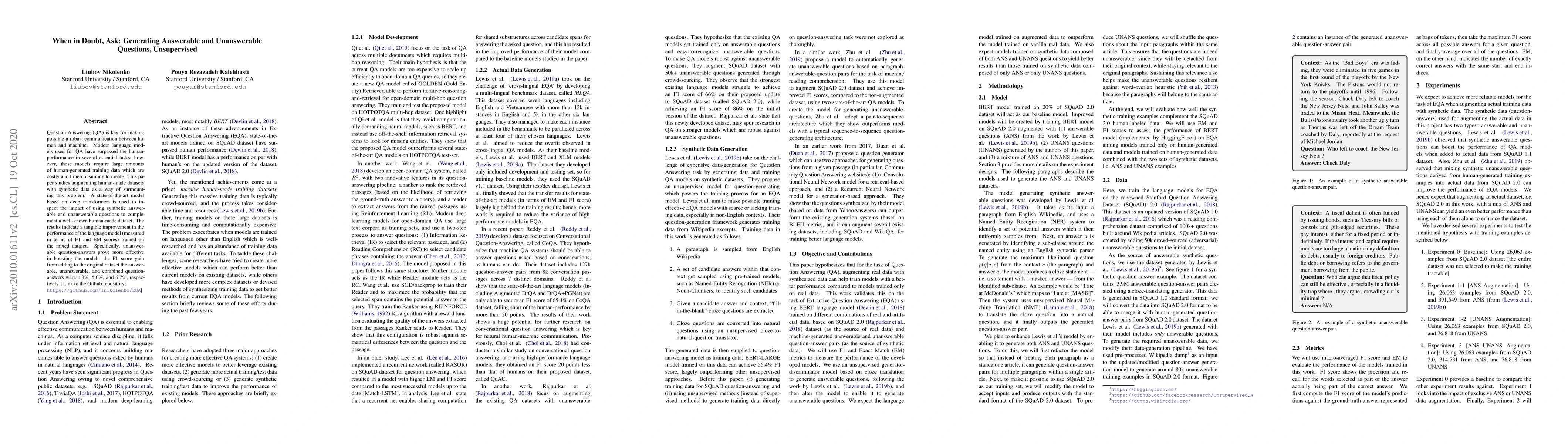 Question Answering (QA) is key for making possible a robust communication between human and machine. Modern language models used for QA have surpassed the human-performance in several essential tasks; however, these models require large amounts of human-generated training data which are costly and time-consuming to create. This paper studies augmenting human-made datasets with synthetic data as a way of surmounting this problem. A state-of-the-art model based on deep transformers is used to inspect the impact of using synthetic answerable and unanswerable questions to complement a well-known human-made dataset. The results indicate a tangible improvement in the performance of the language model (measured in terms of F1 and EM scores) trained on the mixed dataset. Specifically, unanswerable question-answers prove more effective in boosting the model: the F1 score gain from adding to the original dataset the answerable, unanswerable, and combined question-answers were 1.3%, 5.0%, and 6.7%, respectively. [Link to the Github repository: https://github.com/lnikolenko/EQA]
