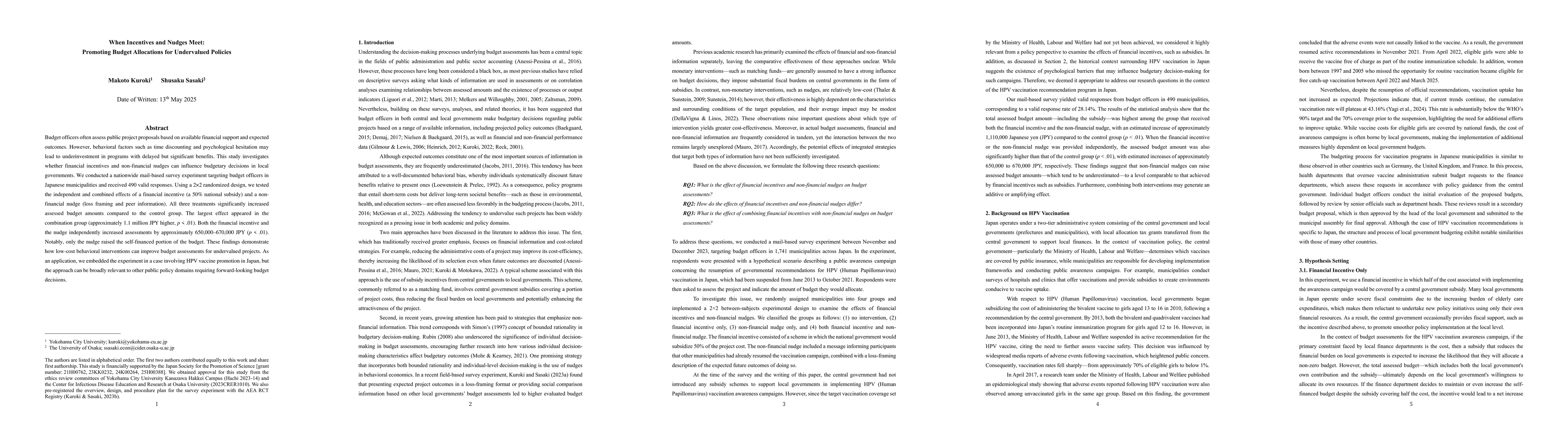 Budget officers often assess public project proposals based on available financial support and expected outcomes. However, behavioral factors such as time discounting and psychological hesitation may lead to underinvestment in programs with delayed but significant benefits. This study investigates whether financial incentives and non-financial nudges can influence budgetary decisions in local governments. We conducted a nationwide mail-based survey experiment targeting budget officers in Japanese municipalities and received 490 valid responses. Using a 2*2 randomized design, we tested the independent and combined effects of a financial incentive (a 50% national subsidy) and a non-financial nudge (loss framing and peer information). All three treatments significantly increased assessed budget amounts compared to the control group. The largest effect appeared in the combination group (approximately 1.1 million JPY higher, p < .01). Both the financial incentive and the nudge independently increased assessments by approximately 650,000-670,000 JPY (p < .01). Notably, only the nudge raised the self-financed portion of the budget. These findings demonstrate how low-cost behavioral interventions can improve budget assessments for undervalued projects. As an application, we embedded the experiment in a case involving HPV vaccine promotion in Japan, but the approach can be broadly relevant to other public policy domains requiring forward-looking budget decisions.