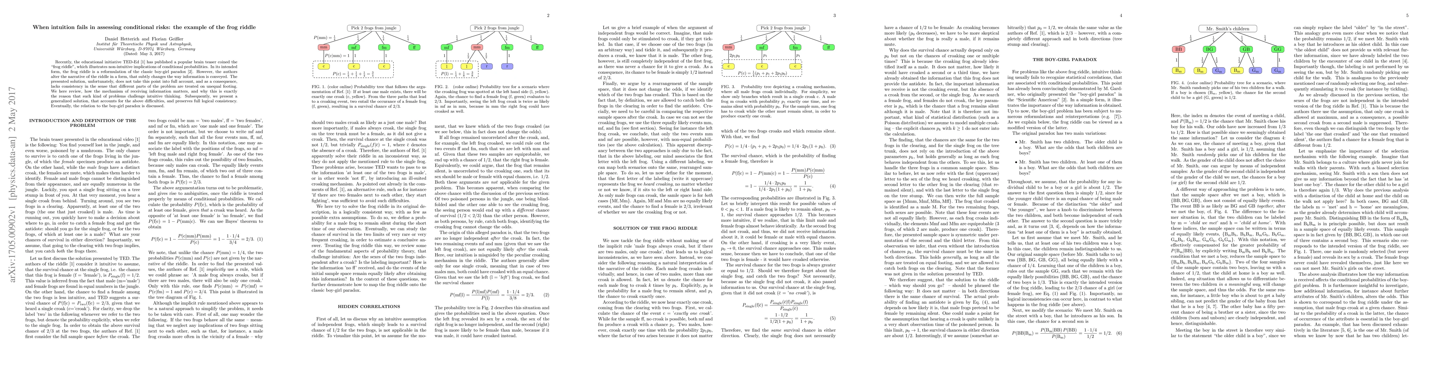 Recently, the educational initiative TED-Ed has published a popular brain teaser coined the 'frog riddle', which illustrates non-intuitive implications of conditional probabilities. In its intended form, the frog riddle is a reformulation of the classic boy-girl paradox. However, the authors alter the narrative of the riddle in a form, that subtly changes the way information is conveyed. The presented solution, unfortunately, does not take this point into full account, and as a consequence, lacks consistency in the sense that different parts of the problem are treated on unequal footing. We here review, how the mechanism of receiving information matters, and why this is exactly the reason that such kind of problems challenge intuitive thinking. Subsequently, we present a generalized solution, that accounts for the above difficulties, and preserves full logical consistency. Eventually, the relation to the boy-girl paradox is discussed.