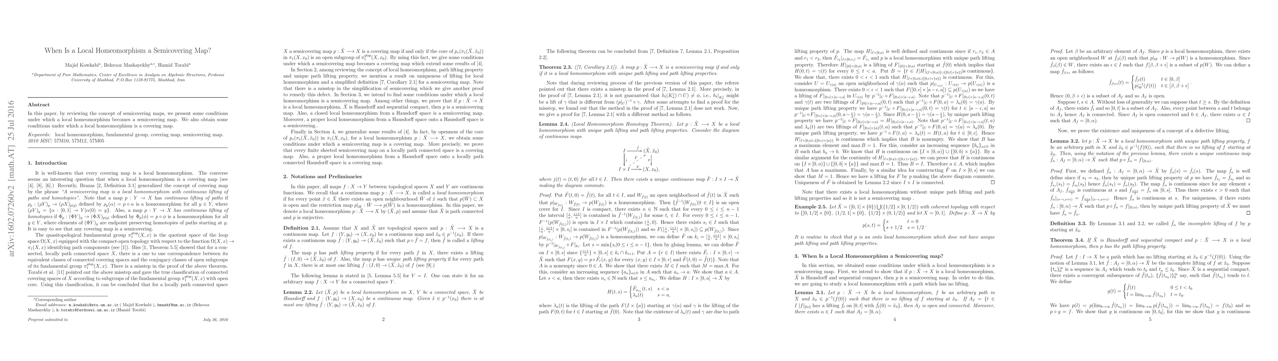 Summary: This paper explores conditions under which a local homeomorphism qualifies as a semicovering map, distinguishing it from covering maps, thereby expanding the understanding of the relationship between these two types of maps in topological spaces.
