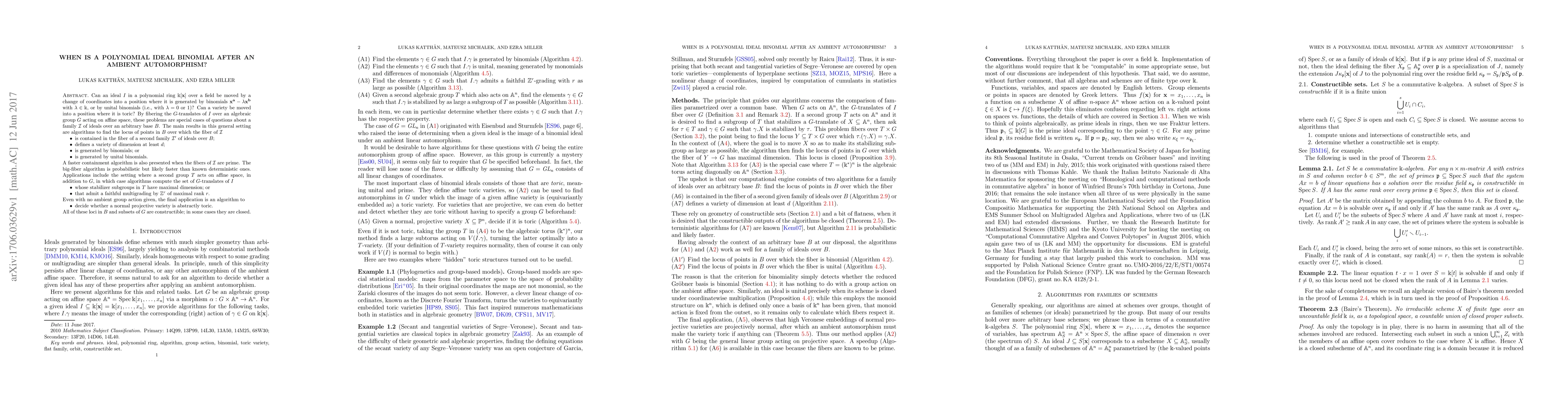 Researchers developed algorithms to determine when a polynomial ideal can be transformed into binomials with specific coefficients, and to identify toric varieties in projective space.