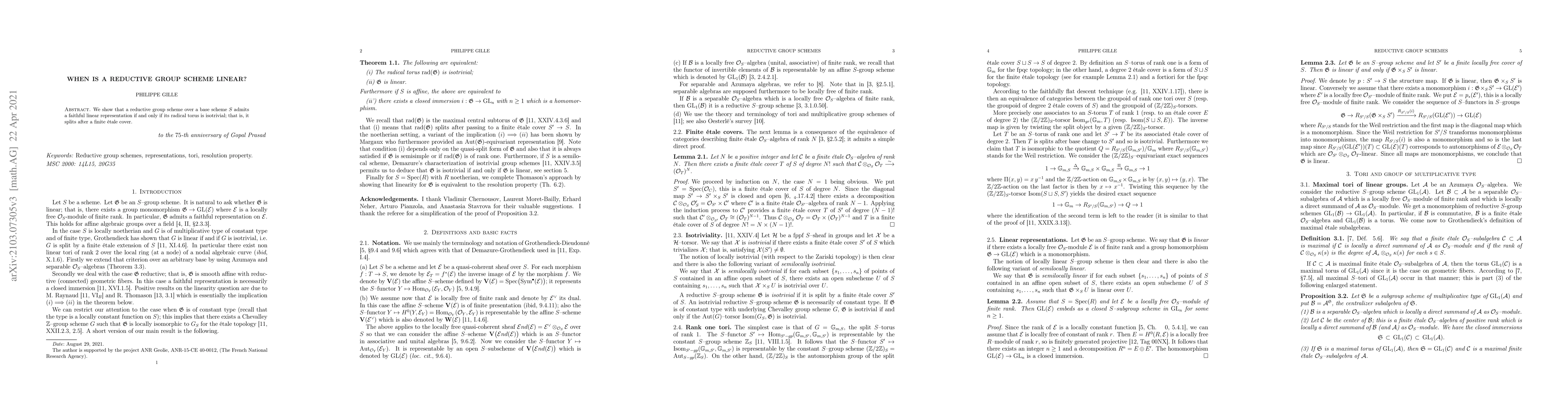 Summary: A reductive group scheme over a base scheme S has a faithful linear representation if and only if its radical torus becomes trivial after a finite étale cover. This condition ensures the existence of such a representation.