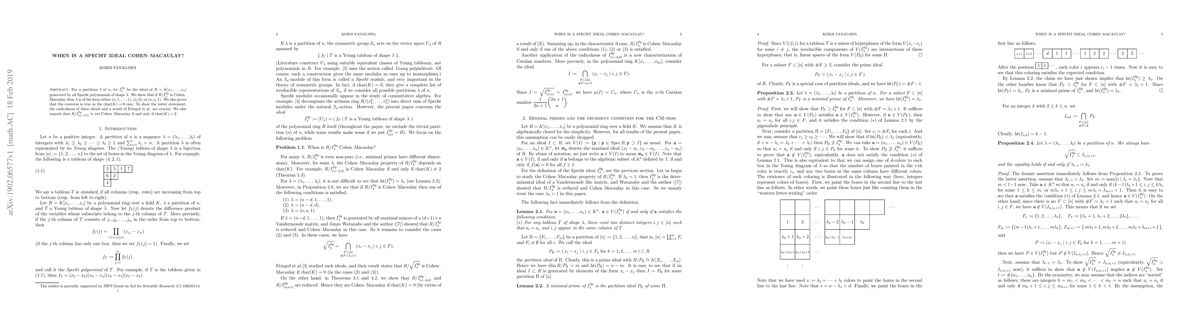 For a partition $\lambda$ of $n$, let $I^{\rm Sp}_\lambda$ be the ideal of $R=K[x_1, \ldots, x_n]$ generated by all Specht polynomials of shape $\lambda$. We show that if $R/I^{\rm Sp}_\lambda$ is Cohen--Macaulay then $\lambda$ is of the form either $(a, 1, \ldots, 1)$, $(a,b)$, or $(a,a,1)$. We also prove that the converse is true if ${\rm char}(K)=0$. To show the latter statement, the radicalness of these ideals and a result of Etingof et al. are crucial. We also remark that $R/I^{\rm Sp}_{(n-3,3)}$ is NOT Cohen--Macaulay if and only if ${\rm char}(K)=2$.