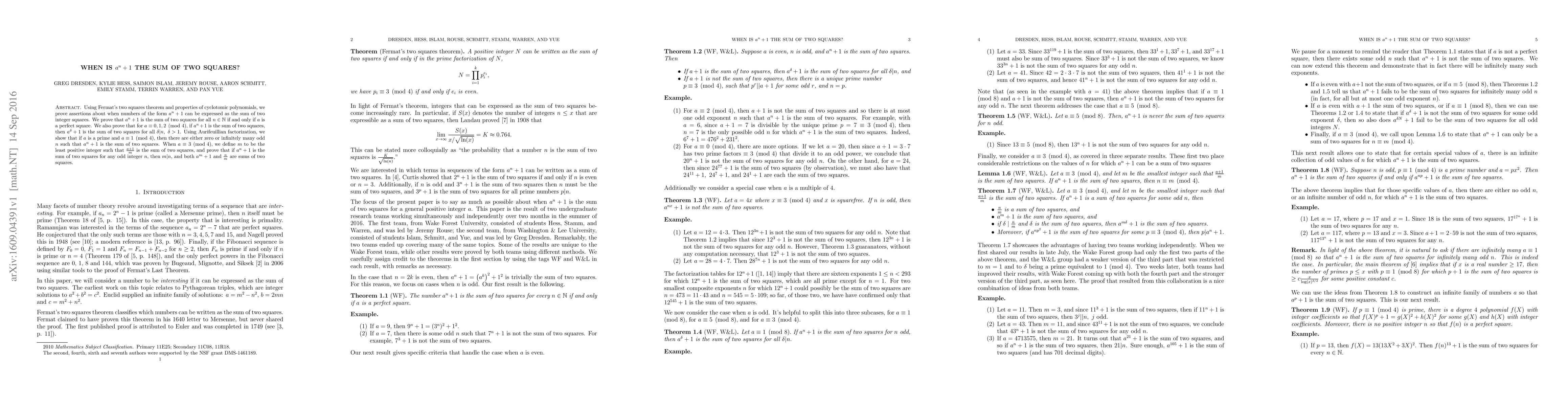 This paper explores conditions under which $a^n + 1$ can be expressed as the sum of two integer squares, leveraging Fermat's two squares theorem and cyclotomic polynomials. It concludes that $a^n + 1$ is the sum of two squares if and only if $a$ is a perfect square, and provides additional insights for specific $a \pmod{4}$ cases.