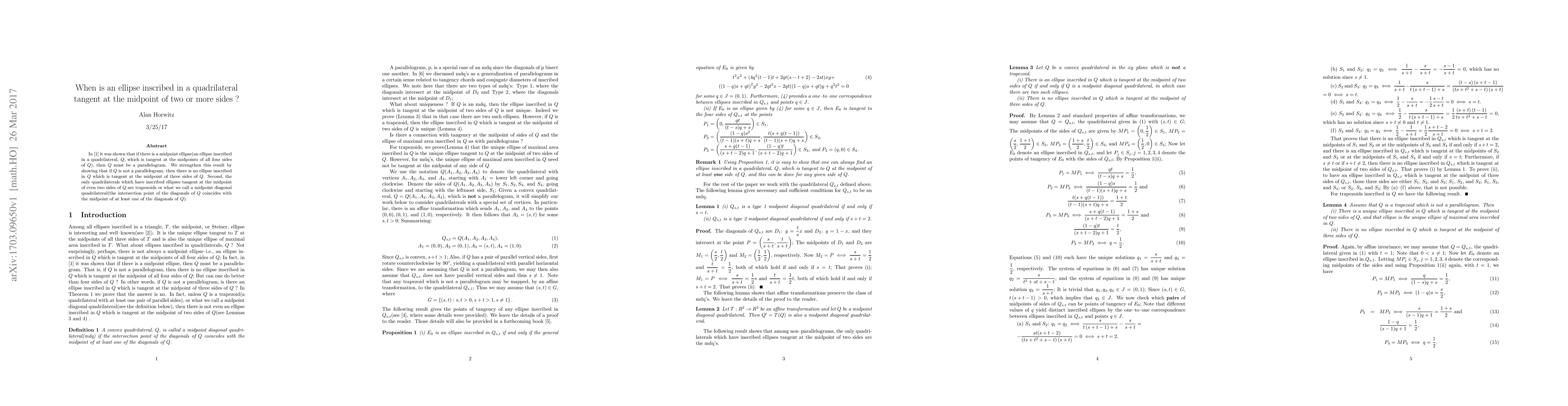 In "Quartic Coincidences and the Singular Value Decomposition" by Clifford and Lachance, Mathematics Magazine, December, 2013, it was shown that if there is a midpoint ellipse(an ellipse inscribed in a quadrilateral, $Q$, which is tangent at the midpoints of all four sides of $Q$), then $Q$ must be a parallelogram. We strengthen this result by showing that if $Q$ is not a parallelogram, then there is no ellipse inscribed in $Q$ which is tangent at the midpoint of three sides of $Q$. Second, the only quadrilaterals which have inscribed ellipses tangent at the midpoint of even two sides of $Q$ are trapezoids or what we call a midpoint diagonal quadrilateral(the intersection point of the diagonals of $Q$ coincides with the midpoint of at least one of the diagonals of $Q$).