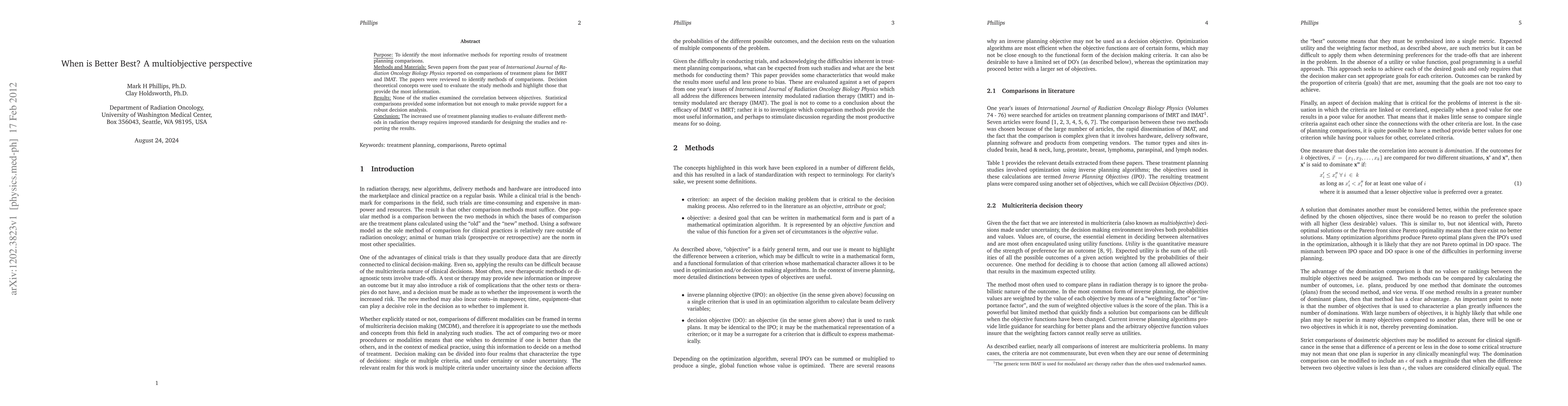 Purpose: To identify the most informative methods for reporting results of treatment planning comparisons. Methods: Seven papers from the past year of International Journal of Radiation Oncology Biology Physics reported on comparisons of treatment plans for IMRT and IMAT. The papers were reviewed to identify methods of comparisons. Decision theoretical concepts were used to evaluate the study methods and highlight those that provide the most information. Results: None of the studies examined the correlation between objectives. Statistical comparisons provided some information but not enough to make provide support for a robust decision analysis. Conclusion: The increased use of treatment planning studies to evaluate different methods in radiation therapy requires improved standards for designing the studies and reporting the results.