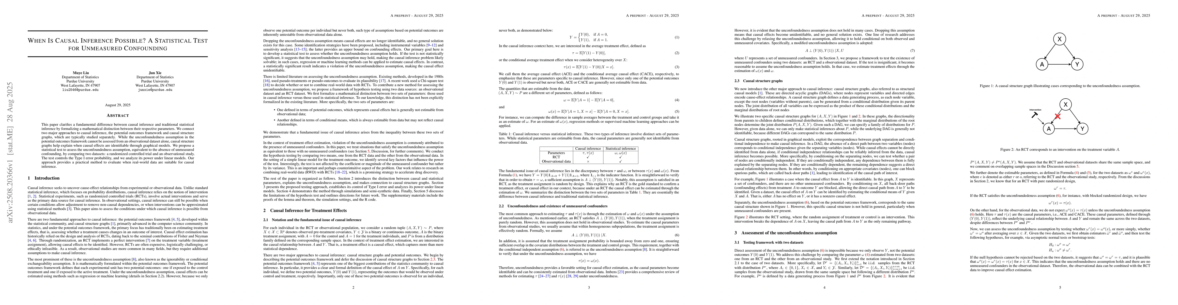 This paper clarifies a fundamental difference between causal inference and traditional statistical inference by formalizing a mathematical distinction between their respective parameters. We connect two major approaches to causal inference, the potential outcomes framework and causal structure graphs, which are typically studied separately. While the unconfoundedness assumption in the potential outcomes framework cannot be assessed from an observational dataset alone, causal structure graphs help explain when causal effects are identifiable through graphical models. We propose a statistical test to assess the unconfoundedness assumption, equivalent to the absence of unmeasured confounding, by comparing two datasets: a randomized controlled trial and an observational study. The test controls the Type I error probability, and we analyze its power under linear models. Our approach provides a practical method to evaluate when real-world data are suitable for causal inference.