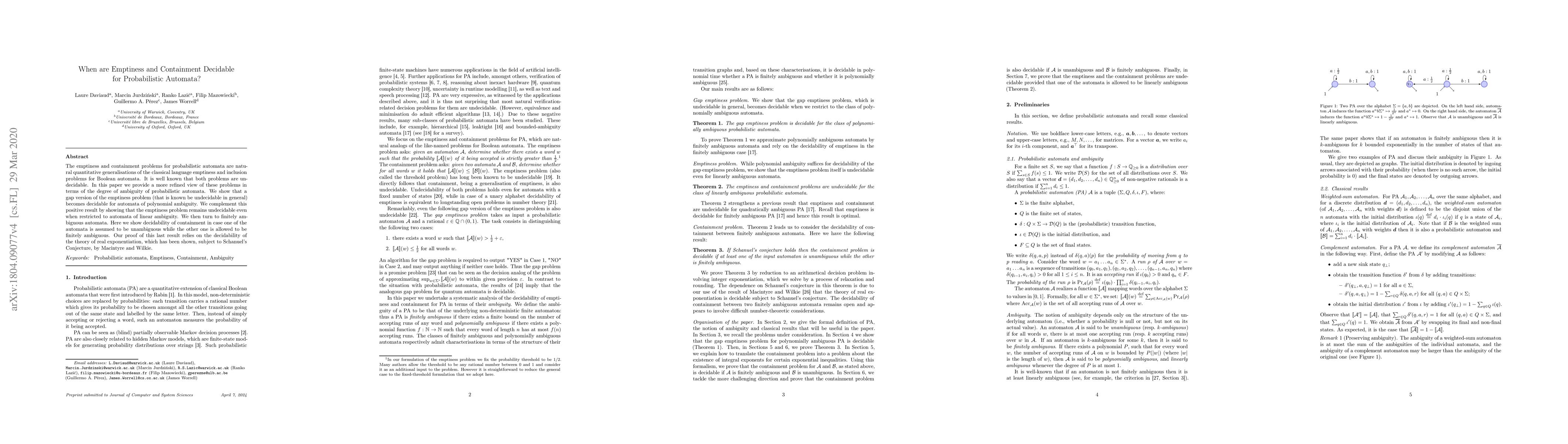 This paper explores decidability conditions for emptiness and containment problems in probabilistic automata, demonstrating that while the problems remain undecidable in general, they become decidable for automata with polynomial ambiguity and for finitely ambiguous automata when one is unambiguous. The decidability of containment for finitely ambiguous automata relies on the decidability of real exponentiation theory.