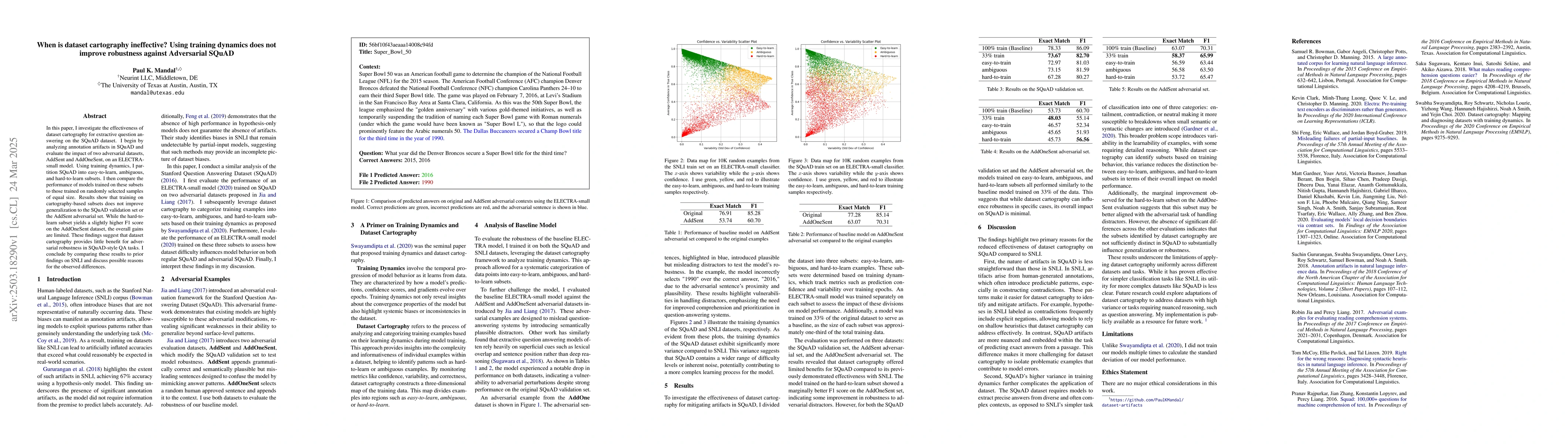 This work differs from previous research by focusing on dataset cartography's effectiveness for adversarial robustness in SQuAD-style QA tasks, revealing that it provides little benefit in this context.