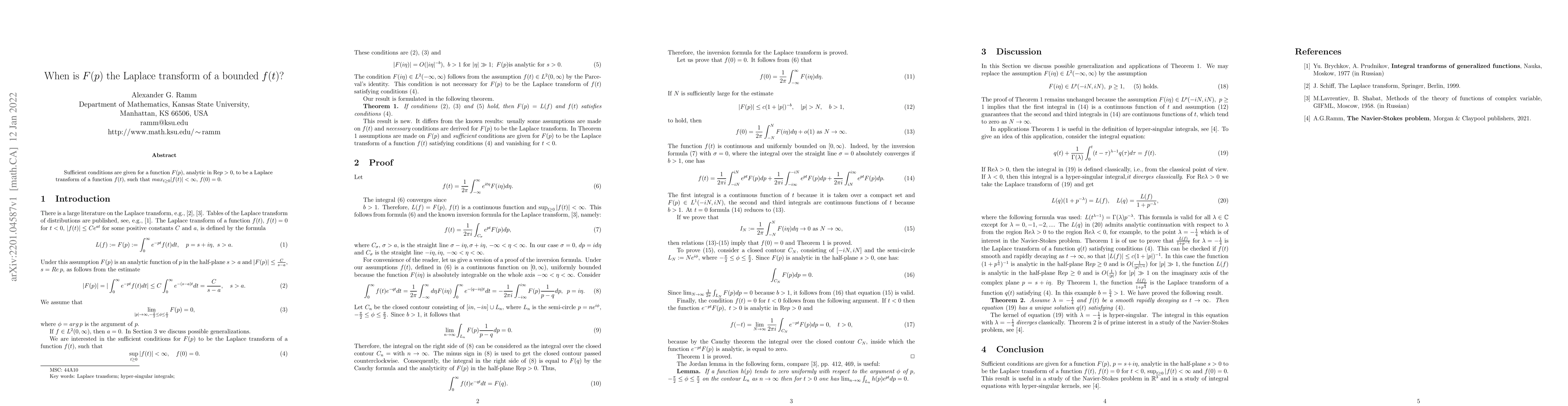 The paper provides sufficient conditions for a function F(p) to be a Laplace transform of a bounded f(t), where max_{t e0}|f(t)|<ty and f(0)=0.