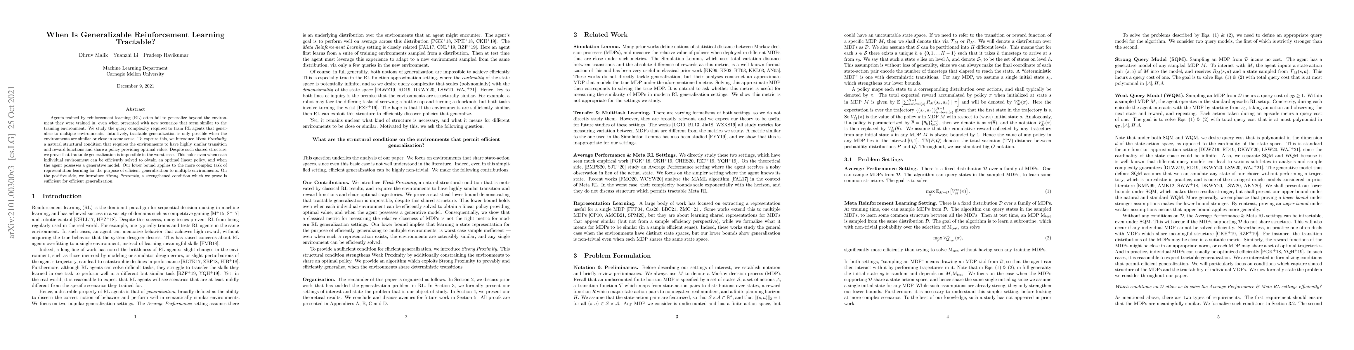 Research shows that generalizable reinforcement learning is only possible when environments have highly similar transition and reward functions, but even with shared structure, efficient generalization to multiple environments is impossible in the worst case. A strengthened condition called Strong Proximity is sufficient for efficient generalization.
