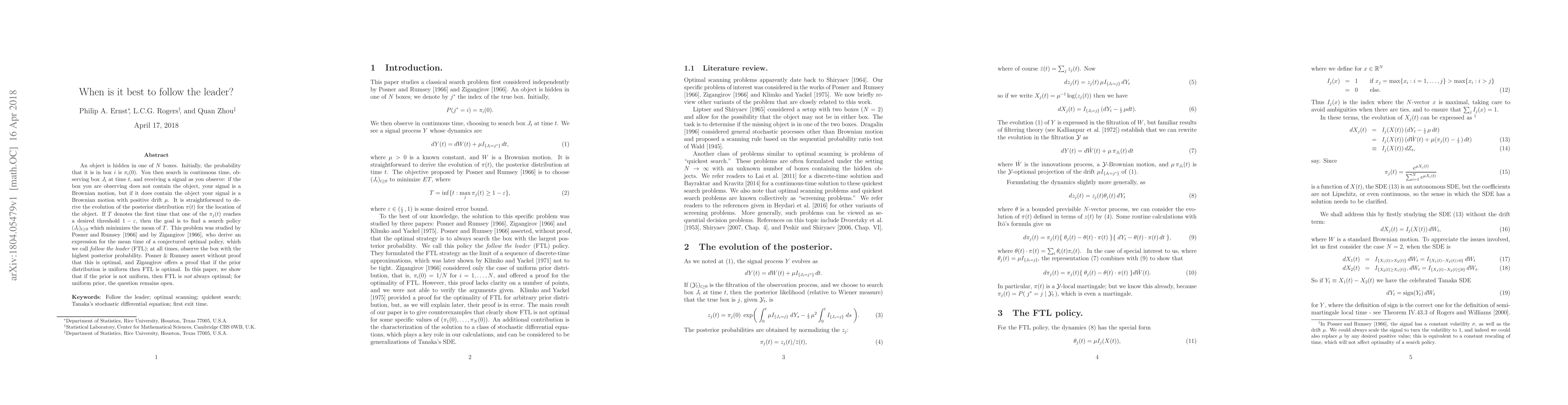 An object is hidden in one of $N$ boxes. Initially, the probability that it is in box $i$ is $\pi_i(0)$. You then search in continuous time, observing box $J_t$ at time $t$, and receiving a signal as you observe: if the box you are observing does not contain the object, your signal is a Brownian motion, but if it does contain the object your signal is a Brownian motion with positive drift $\mu$. It is straightforward to derive the evolution of the posterior distribution $\pi(t)$ for the location of the object. If $T$ denotes the first time that one of the $\pi_j(t)$ reaches a desired threshold $1-\varepsilon$, then the goal is to find a search policy $(J_t)_{t \geq 0}$ which minimizes the mean of $T$. This problem was studied by Posner and Rumsey (1966) and by Zigangirov (1966), who derive an expression for the mean time of a conjectured optimal policy, which we call {\em follow the leader} (FTL); at all times, observe the box with the highest posterior probability. Posner and Rumsey assert without proof that this is optimal, and Zigangirov offers a proof that if the prior distribution is uniform then FTL is optimal. In this paper, we show that if the prior is not uniform, then FTL is {\em not} always optimal; for uniform prior, the question remains open.