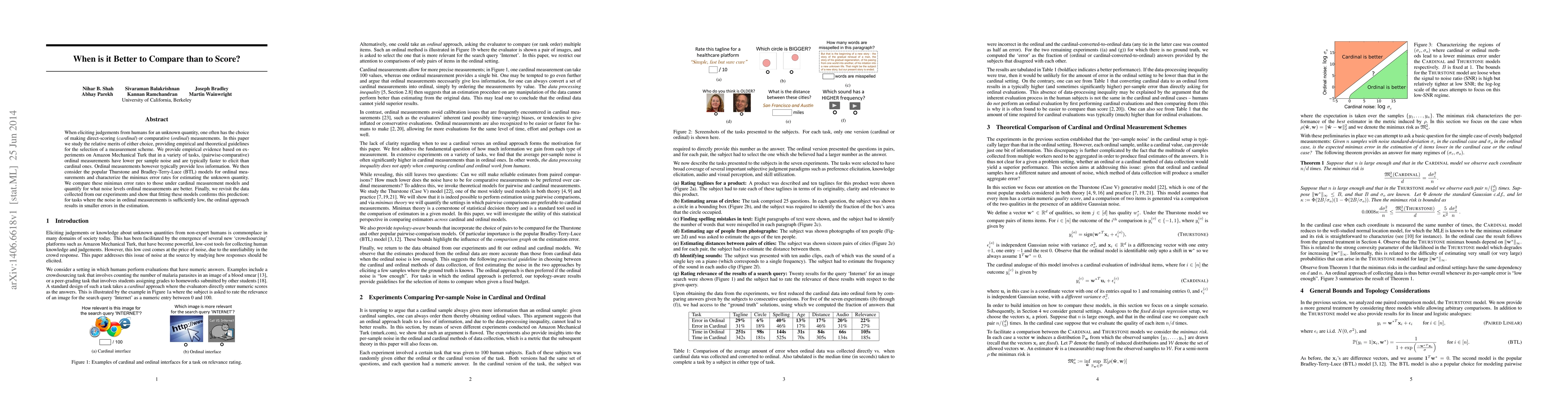 When eliciting judgements from humans for an unknown quantity, one often has the choice of making direct-scoring (cardinal) or comparative (ordinal) measurements. In this paper we study the relative merits of either choice, providing empirical and theoretical guidelines for the selection of a measurement scheme. We provide empirical evidence based on experiments on Amazon Mechanical Turk that in a variety of tasks, (pairwise-comparative) ordinal measurements have lower per sample noise and are typically faster to elicit than cardinal ones. Ordinal measurements however typically provide less information. We then consider the popular Thurstone and Bradley-Terry-Luce (BTL) models for ordinal measurements and characterize the minimax error rates for estimating the unknown quantity. We compare these minimax error rates to those under cardinal measurement models and quantify for what noise levels ordinal measurements are better. Finally, we revisit the data collected from our experiments and show that fitting these models confirms this prediction: for tasks where the noise in ordinal measurements is sufficiently low, the ordinal approach results in smaller errors in the estimation.
