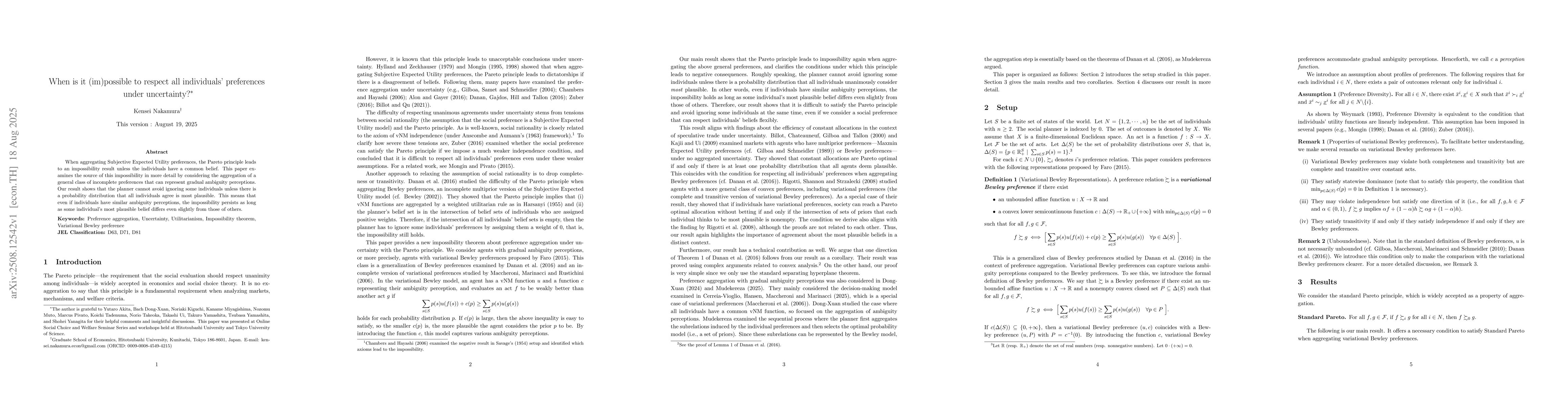 When aggregating Subjective Expected Utility preferences, the Pareto principle leads to an impossibility result unless the individuals have a common belief. This paper examines the source of this impossibility in more detail by considering the aggregation of a general class of incomplete preferences that can represent gradual ambiguity perceptions. Our result shows that the planner cannot avoid ignoring some individuals unless there is a probability distribution that all individuals agree is most plausible. This means that even if individuals have similar ambiguity perceptions, the impossibility persists as long as some individual's most plausible belief differs even slightly from those of others.