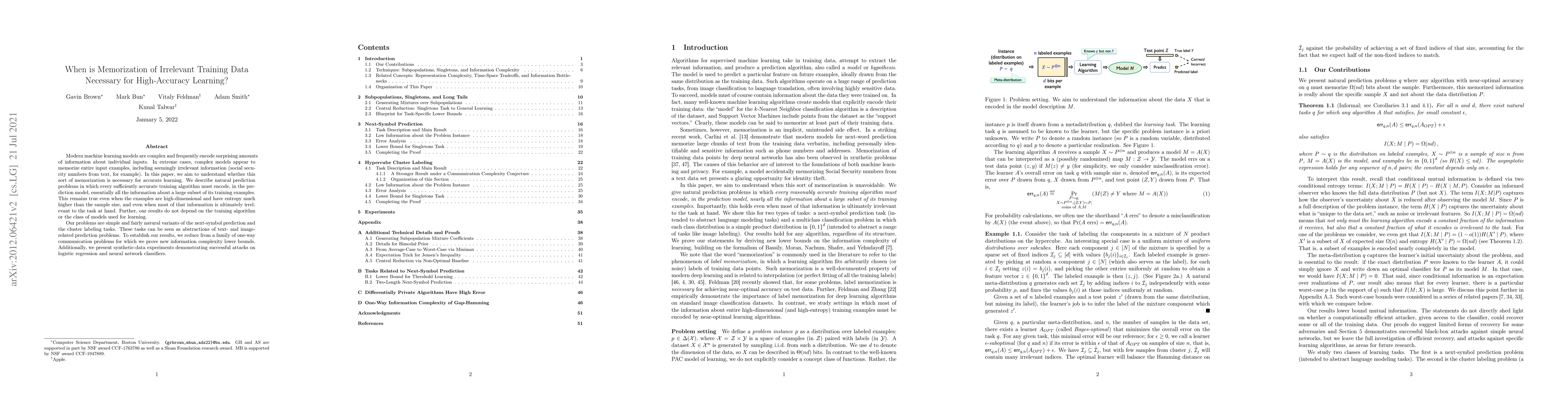 Modern machine learning models are complex and frequently encode surprising amounts of information about individual inputs. In extreme cases, complex models appear to memorize entire input examples, including seemingly irrelevant information (social security numbers from text, for example). In this paper, we aim to understand whether this sort of memorization is necessary for accurate learning. We describe natural prediction problems in which every sufficiently accurate training algorithm must encode, in the prediction model, essentially all the information about a large subset of its training examples. This remains true even when the examples are high-dimensional and have entropy much higher than the sample size, and even when most of that information is ultimately irrelevant to the task at hand. Further, our results do not depend on the training algorithm or the class of models used for learning. Our problems are simple and fairly natural variants of the next-symbol prediction and the cluster labeling tasks. These tasks can be seen as abstractions of text- and image-related prediction problems. To establish our results, we reduce from a family of one-way communication problems for which we prove new information complexity lower bounds. Additionally, we present synthetic-data experiments demonstrating successful attacks on logistic regression and neural network classifiers.