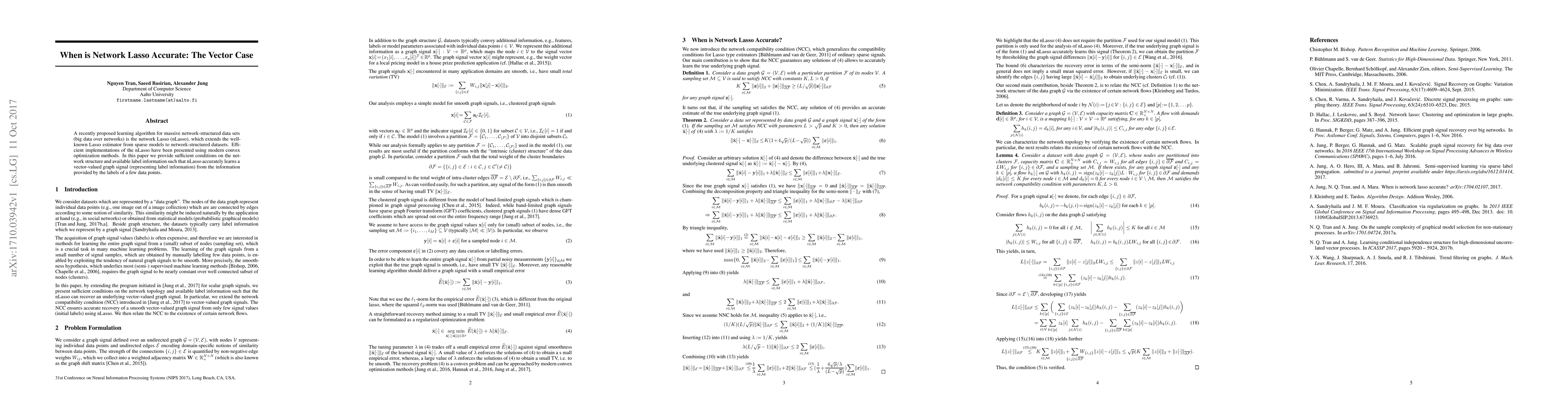 A recently proposed learning algorithm for massive network-structured data sets (big data over networks) is the network Lasso (nLasso), which extends the well- known Lasso estimator from sparse models to network-structured datasets. Efficient implementations of the nLasso have been presented using modern convex optimization methods. In this paper, we provide sufficient conditions on the network structure and available label information such that nLasso accurately learns a vector-valued graph signal (representing label information) from the information provided by the labels of a few data points.