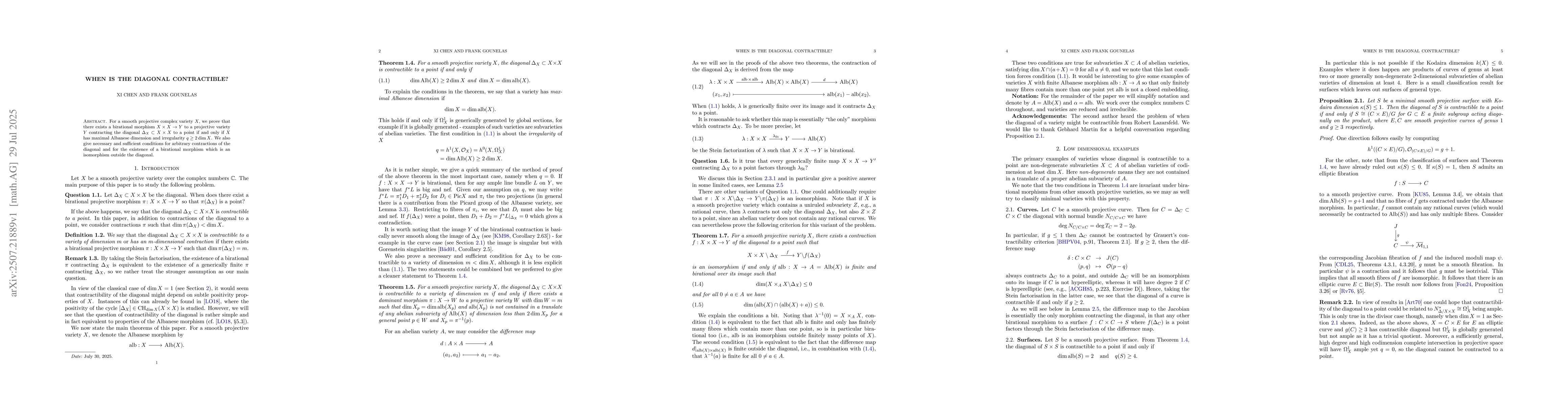 For a smooth projective complex variety $X$, we prove that there exists a birational morphism $X\times X\to Y$ to a projective variety $Y$ contracting the diagonal $\Delta_X\subset X\times X$ to a point if and only if $X$ has maximal Albanese dimension and irregularity $q\geq 2\dim X$. We also give necessary and sufficient conditions for arbitrary contractions of the diagonal and for the existence of a birational morphism which is an isomorphism outside the diagonal.