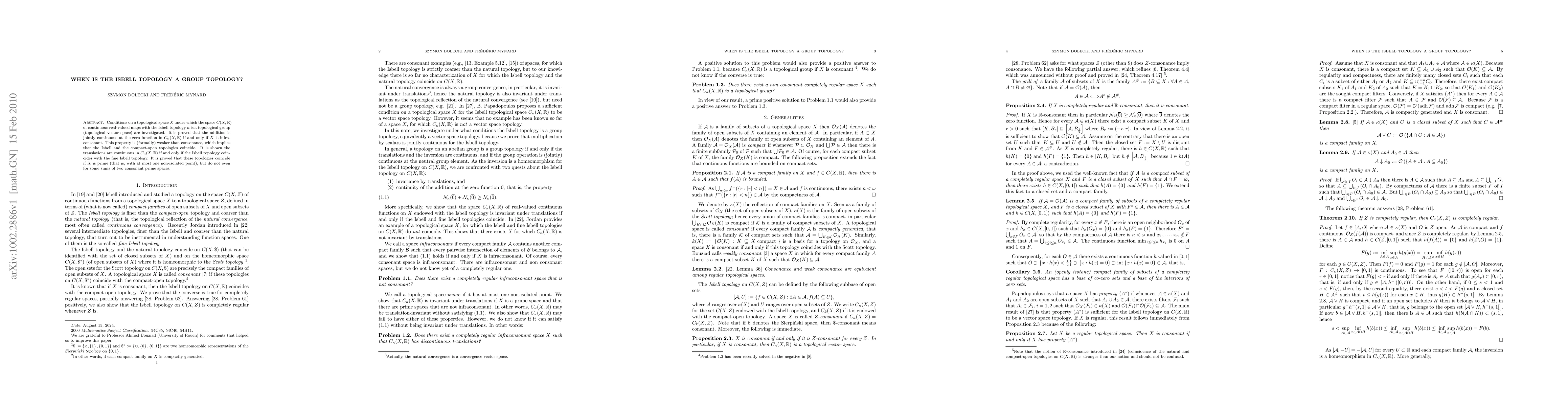 This paper investigates conditions under which the Isbell topology on the space of continuous real-valued functions on $X$ forms a topological group. It finds that the Isbell topology coincides with the compact-open topology if $X$ is infraconsonant, and the translations are continuous if $X$ is prime.