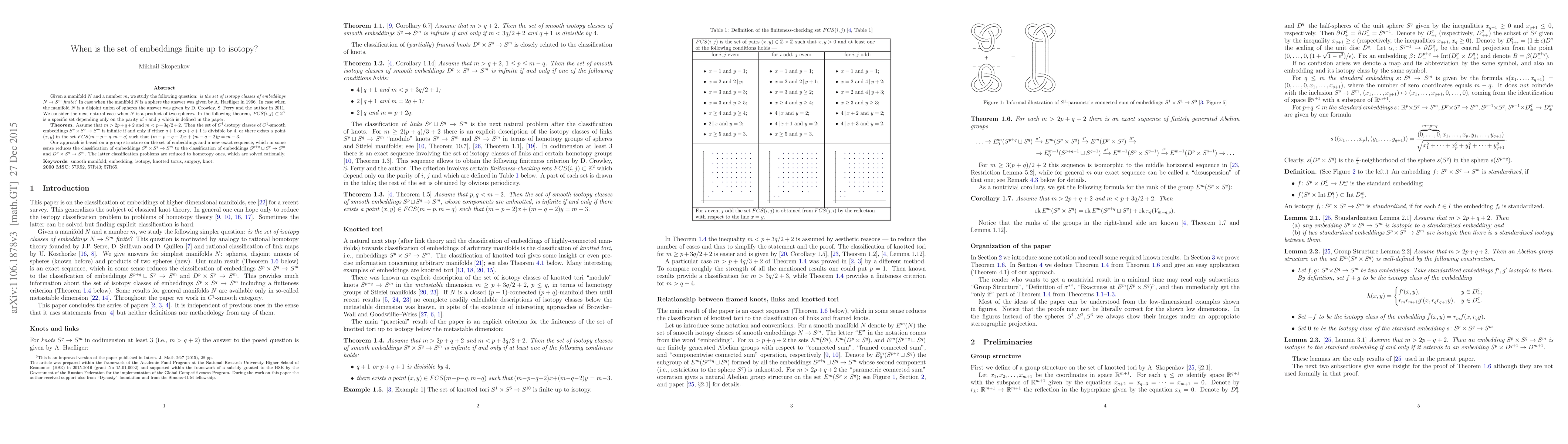 S^m is infinite if and only if either q+1 or p+q+1 is divisible by 4, or there exists a point (x,y) in the set FCS(m-p-q,m-q) such that (m-p-q-2)x+(m-q-2)y=m-3. Our approach is based on a group structure on the set of embeddings and a new exact sequence, which in some sense reduces the classification of embeddings S^p x S^q -> S^m to the classification of embeddings S^{p+q} |_| S^q -> S^m and D^p x S^q -> S^m. The latter classification problems are reduced to homotopy ones, which are solved rationally.