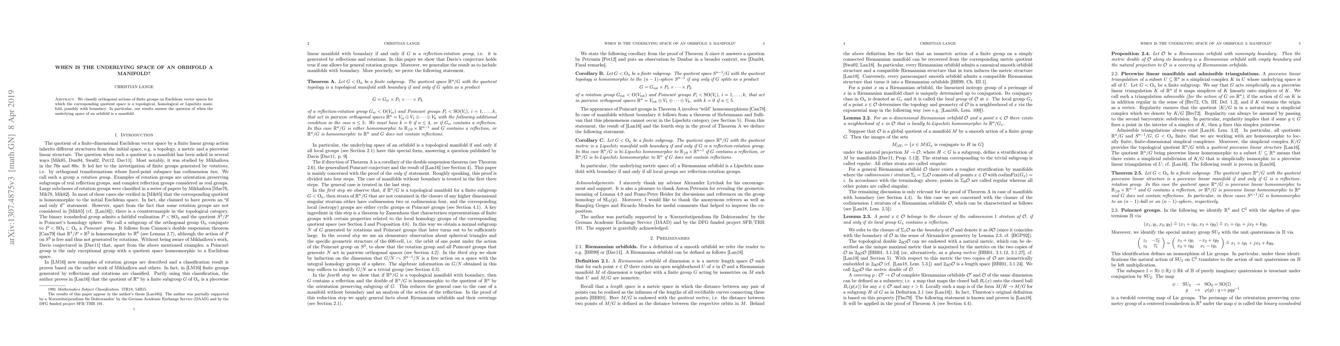 This paper classifies orthogonal actions of finite groups on Euclidean vector spaces resulting in quotient spaces that are topological, homological, or Lipschitz manifolds, potentially with boundaries, thereby answering when an orbifold's underlying space is a manifold.