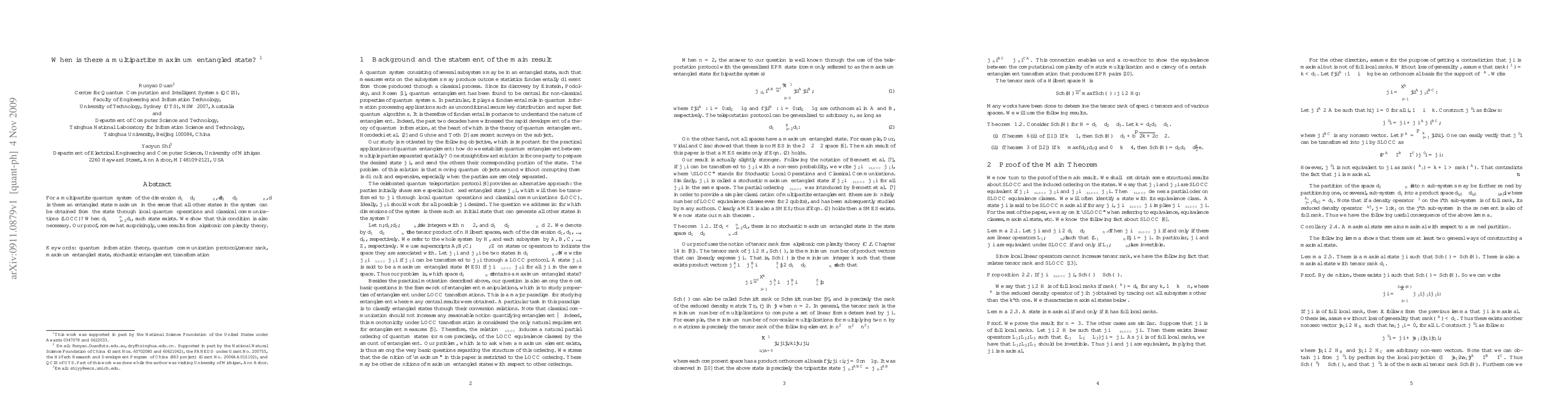 For a multipartite quantum system of the dimension $d_1\otimes d_2\otimes... d_n$, $d_1\ge d_2\ge...\ge d_n$, is there an entangled state {\em maximum} in the sense that all other states in the system can be obtained from the state through local quantum operations and classical communications (LOCC)? When $d_1\ge\Pi_{i=2}^n d_i$, such state exists. We show that this condition is also necessary. Our proof, somewhat surprisingly, uses results from algebraic complexity theory.