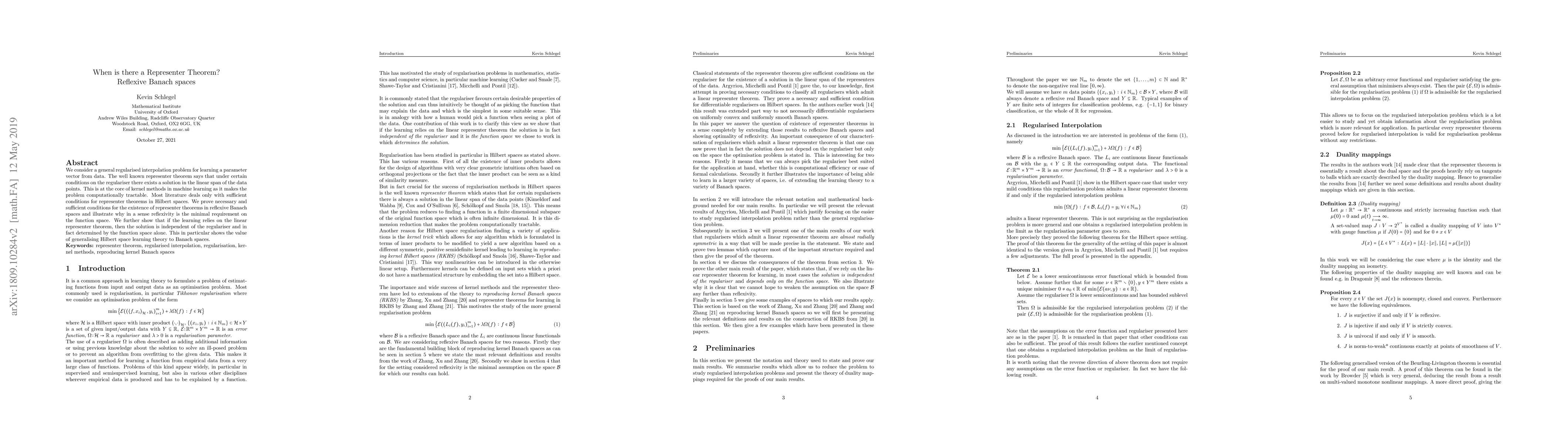 The paper analyzes regularized interpolation problems in reflexive Banach spaces, extending the representer theorem from Hilbert spaces to these more general spaces.