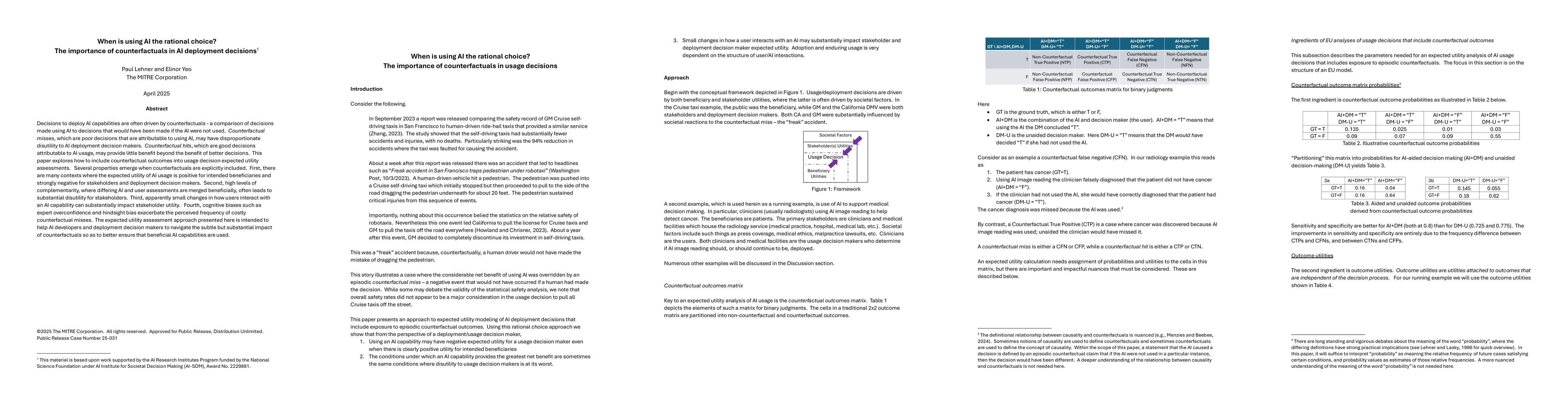 Decisions to deploy AI capabilities are often driven by counterfactuals - a comparison of decisions made using AI to decisions that would have been made if the AI were not used. Counterfactual misses, which are poor decisions that are attributable to using AI, may have disproportionate disutility to AI deployment decision makers. Counterfactual hits, which are good decisions attributable to AI usage, may provide little benefit beyond the benefit of better decisions. This paper explores how to include counterfactual outcomes into usage decision expected utility assessments. Several properties emerge when counterfactuals are explicitly included. First, there are many contexts where the expected utility of AI usage is positive for intended beneficiaries and strongly negative for stakeholders and deployment decision makers. Second, high levels of complementarity, where differing AI and user assessments are merged beneficially, often leads to substantial disutility for stakeholders. Third, apparently small changes in how users interact with an AI capability can substantially impact stakeholder utility. Fourth, cognitive biases such as expert overconfidence and hindsight bias exacerbate the perceived frequency of costly counterfactual misses. The expected utility assessment approach presented here is intended to help AI developers and deployment decision makers to navigate the subtle but substantial impact of counterfactuals so as to better ensure that beneficial AI capabilities are used.