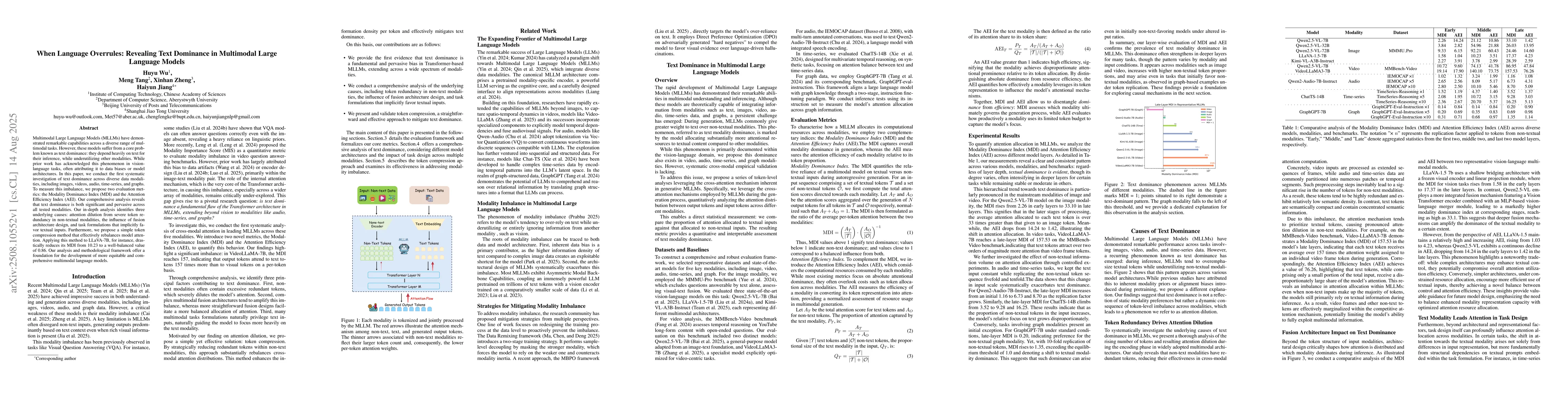 Multimodal Large Language Models (MLLMs) have demonstrated remarkable capabilities across a diverse range of multimodal tasks. However, these models suffer from a core problem known as text dominance: they depend heavily on text for their inference, while underutilizing other modalities. While prior work has acknowledged this phenomenon in vision-language tasks, often attributing it to data biases or model architectures. In this paper, we conduct the first systematic investigation of text dominance across diverse data modalities, including images, videos, audio, time-series, and graphs. To measure this imbalance, we propose two evaluation metrics: the Modality Dominance Index (MDI) and the Attention Efficiency Index (AEI). Our comprehensive analysis reveals that text dominance is both significant and pervasive across all tested modalities. Our in-depth analysis identifies three underlying causes: attention dilution from severe token redundancy in non-textual modalities, the influence of fusion architecture design, and task formulations that implicitly favor textual inputs. Furthermore, we propose a simple token compression method that effectively rebalances model attention. Applying this method to LLaVA-7B, for instance, drastically reduces its MDI from 10.23 to a well-balanced value of 0.86. Our analysis and methodological framework offer a foundation for the development of more equitable and comprehensive multimodal language models.