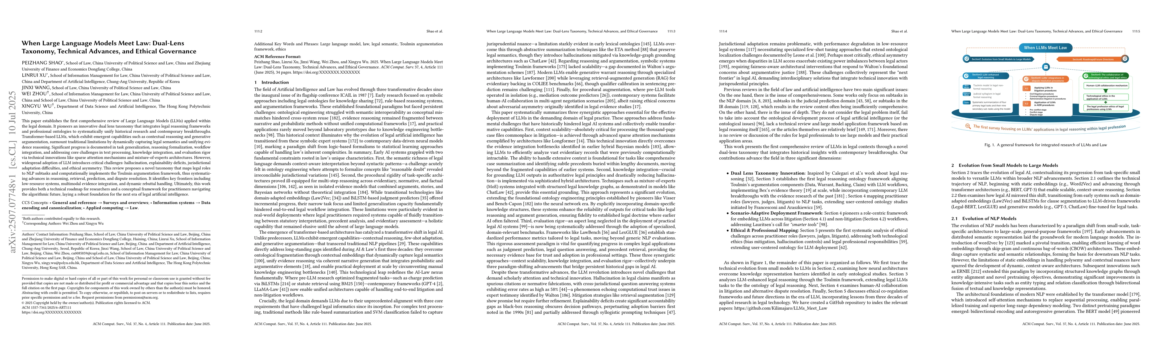 This paper establishes the first comprehensive review of Large Language Models (LLMs) applied within the legal domain. It pioneers an innovative dual lens taxonomy that integrates legal reasoning frameworks and professional ontologies to systematically unify historical research and contemporary breakthroughs. Transformer-based LLMs, which exhibit emergent capabilities such as contextual reasoning and generative argumentation, surmount traditional limitations by dynamically capturing legal semantics and unifying evidence reasoning. Significant progress is documented in task generalization, reasoning formalization, workflow integration, and addressing core challenges in text processing, knowledge integration, and evaluation rigor via technical innovations like sparse attention mechanisms and mixture-of-experts architectures. However, widespread adoption of LLM introduces critical challenges: hallucination, explainability deficits, jurisdictional adaptation difficulties, and ethical asymmetry. This review proposes a novel taxonomy that maps legal roles to NLP subtasks and computationally implements the Toulmin argumentation framework, thus systematizing advances in reasoning, retrieval, prediction, and dispute resolution. It identifies key frontiers including low-resource systems, multimodal evidence integration, and dynamic rebuttal handling. Ultimately, this work provides both a technical roadmap for researchers and a conceptual framework for practitioners navigating the algorithmic future, laying a robust foundation for the next era of legal artificial intelligence. We have created a GitHub repository to index the relevant papers: https://github.com/Kilimajaro/LLMs_Meet_Law.