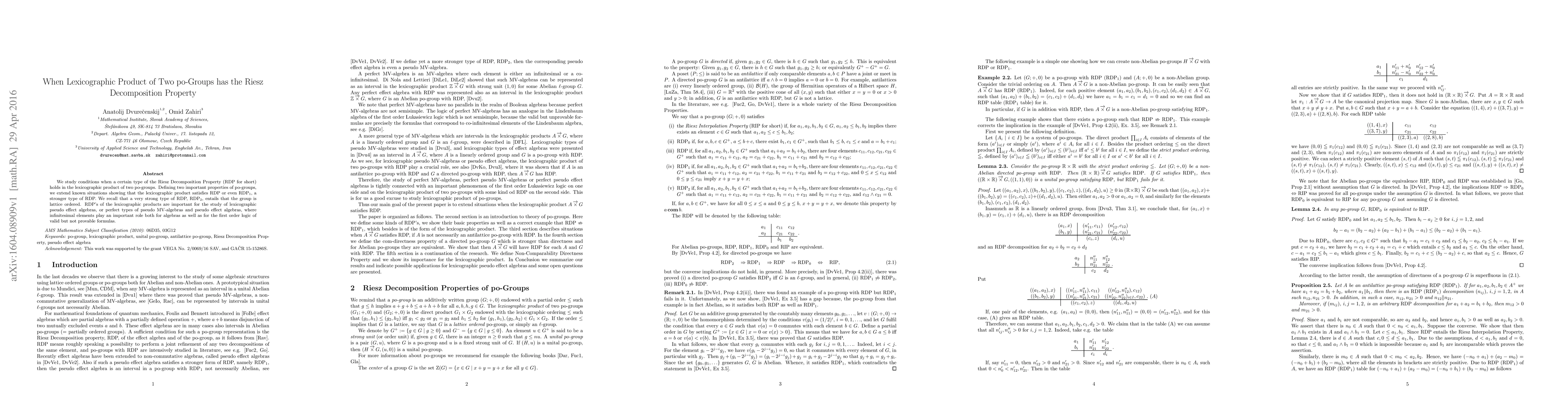 This paper investigates conditions under which the lexicographic product of two po-groups exhibits the Riesz Decomposition Property (RDP). The authors define two significant properties of po-groups to extend known results, demonstrating that the lexicographic product can satisfy RDP or even the stronger RDP$_1$, and discuss the implications for pseudo effect algebras and pseudo MV-algebras.