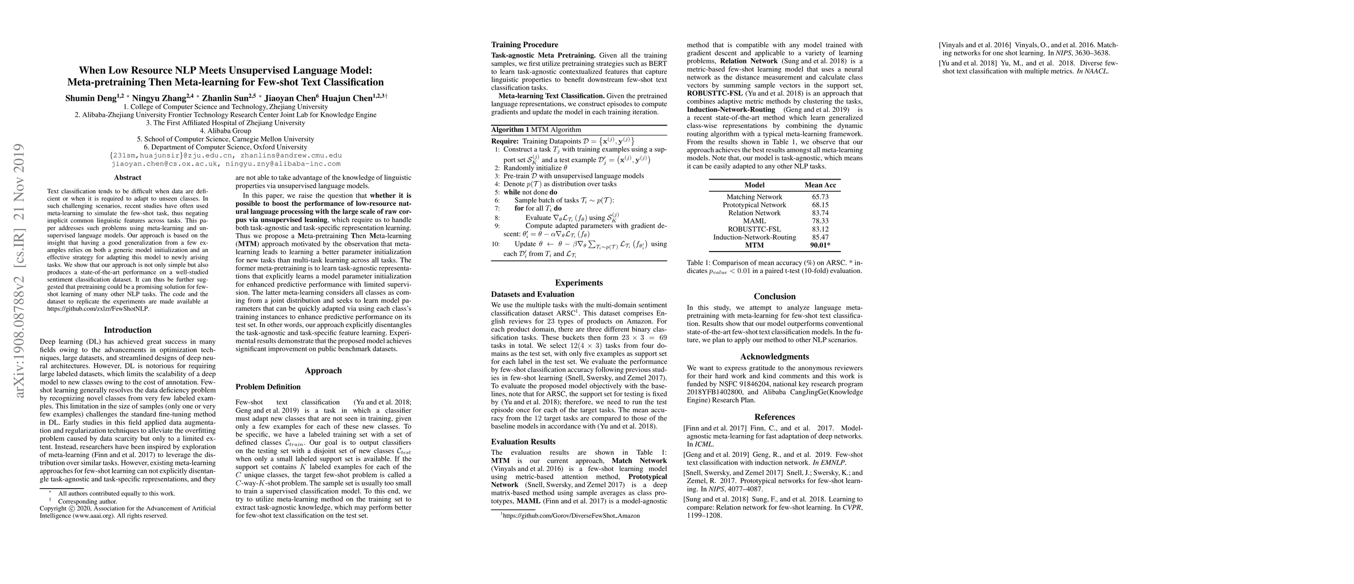 This paper proposes a novel method for few-shot text classification using meta-learning and unsupervised language models. The approach combines a good generic model initialization with an effective adaptation strategy to new tasks, demonstrating state-of-the-art performance on sentiment classification and suggesting its potential for other NLP tasks.