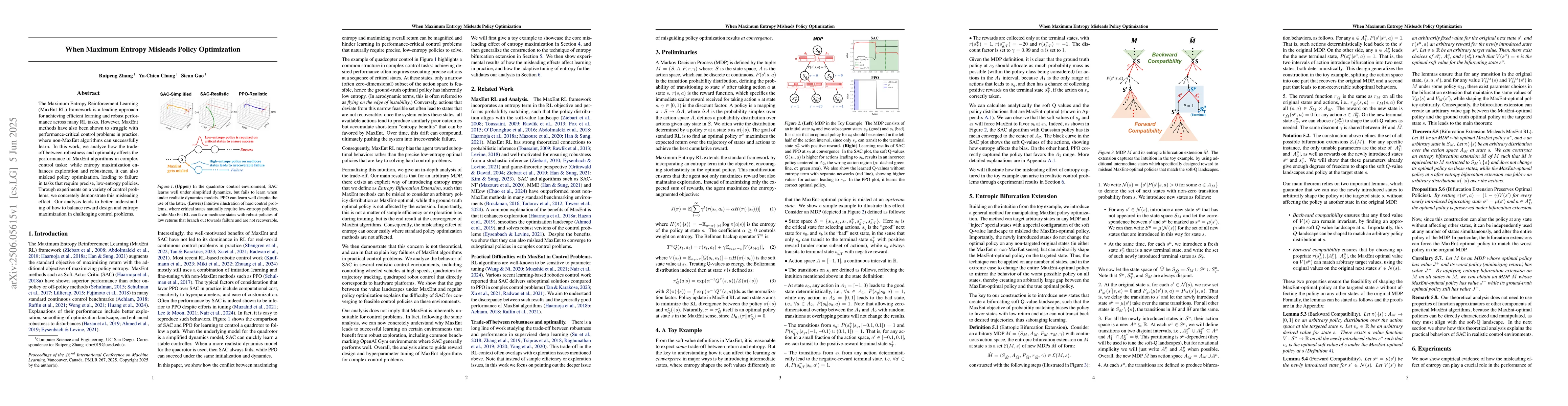 The paper analyzes the Maximum Entropy Reinforcement Learning (MaxEnt RL) framework, finding that while it enhances exploration and robustness, it can mislead policy optimization in complex control tasks requiring precise, low-entropy policies. Experiments on various control problems demonstrate this misleading effect, contributing to a better understanding of balancing reward design and entropy maximization in challenging control problems.