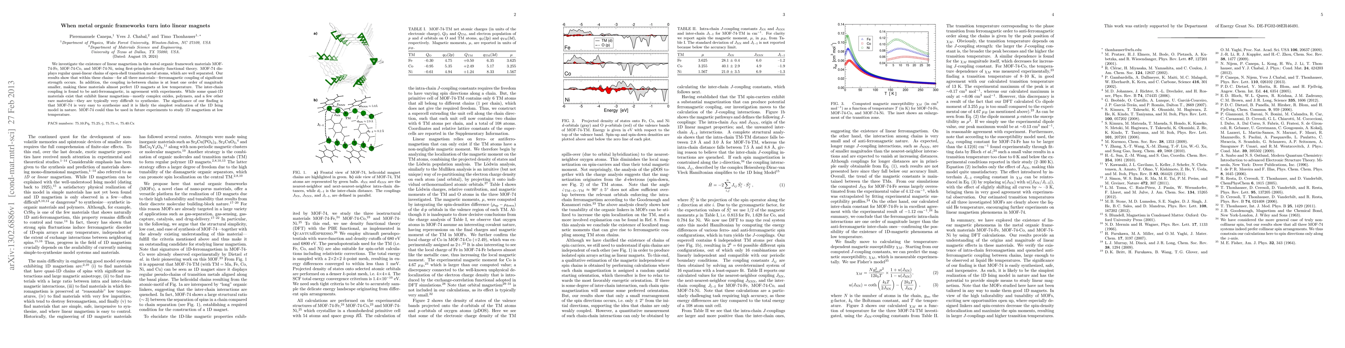 Researchers found that metal organic frameworks MOF-74-Fe, MOF-74-Co, and MOF-74-Ni exhibit linear magnetism due to strong ferromagnetic coupling within quasi-linear chains, with negligible inter-chain coupling, making them nearly perfect 1D magnets at low temperatures.
