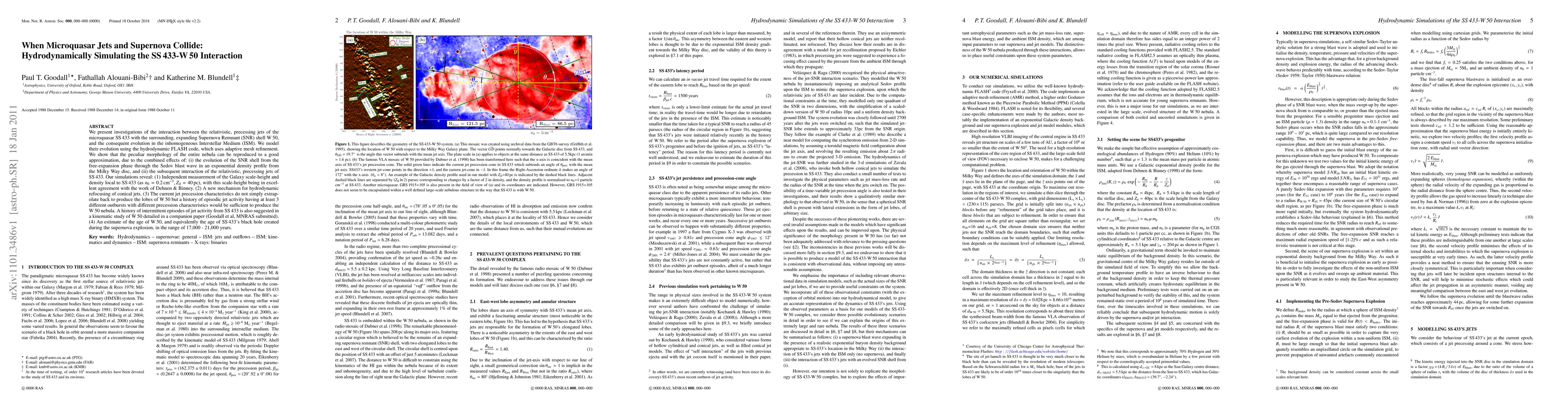 We present investigations of the interaction between the relativistic, precessing jets of the microquasar SS433 with the surrounding, expanding Supernova Remnant (SNR) shell W50, and the consequent evolution in the inhomogeneous Interstellar Medium (ISM). We model their evolution using the hydrodynamic FLASH code, which uses adaptive mesh refinement. We show that the peculiar morphology of the entire nebula can be reproduced to a good approximation, due to the combined effects of: (i) the evolution of the SNR shell from the free-expansion phase through the Sedov blast wave in an exponential density profile from the Milky Way disc, and (ii) the subsequent interaction of the relativistic, precessing jets of SS 433. Our simulations reveal: (1) Independent measurement of the Galaxy scale-height and density local to SS433 (as n_0 = 0.2 cm^{-3}, Z_d = 40 pc), with this scale-height being in excellent agreement with the work of Dehnen & Binney. (2) A new mechanism for hydrodynamic refocusing of conical jets. (3) The current jet precession characteristics do not simply extrapolate back to produce the lobes of W50 but a history of episodic jet activity having at least 3 different outbursts with different precession characteristics would be sufficient to produce the W50 nebula. A history of intermittent episodes of jet activity from SS433 is also suggested in a kinematic study of W50 detailed in a companion paper (Goodall et al, MNRAS submitted). (4) An estimate of the age of W50, and equivalently the age of SS433's black hole created during the supernova explosion, in the range of 17,000 - 21,000 years.