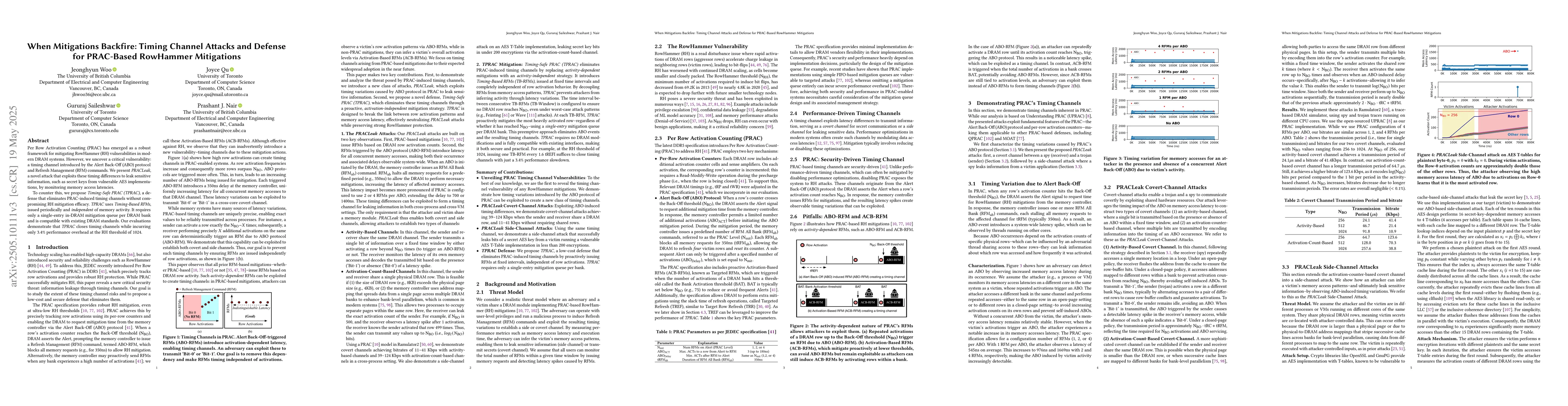The paper reveals a timing channel vulnerability in Per Row Activation Counting (PRAC), a RowHammer mitigation technique, which can be exploited to leak sensitive information. It introduces Timing-Safe PRAC (TPRAC) as a defense, maintaining PRAC's effectiveness while eliminating timing channels, with minimal performance overhead.