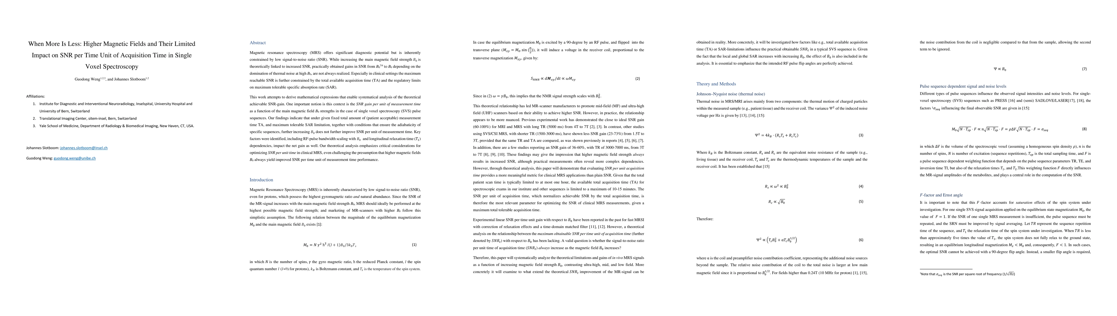 The work challenges the common belief that higher magnetic fields always improve SNR per time unit in MRS, offering a theoretical framework to systematically analyze and optimize SNR under practical clinical constraints.